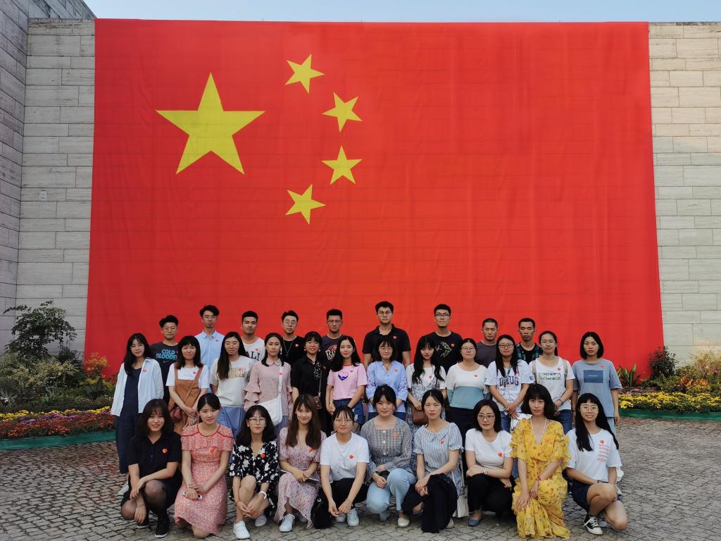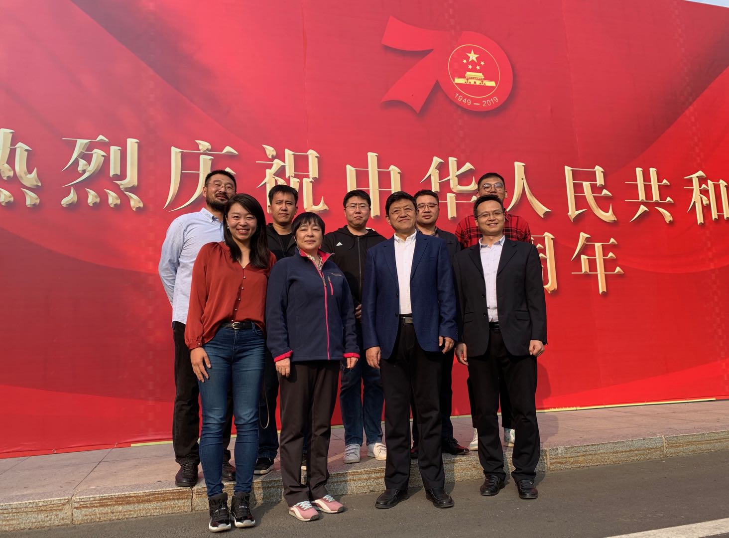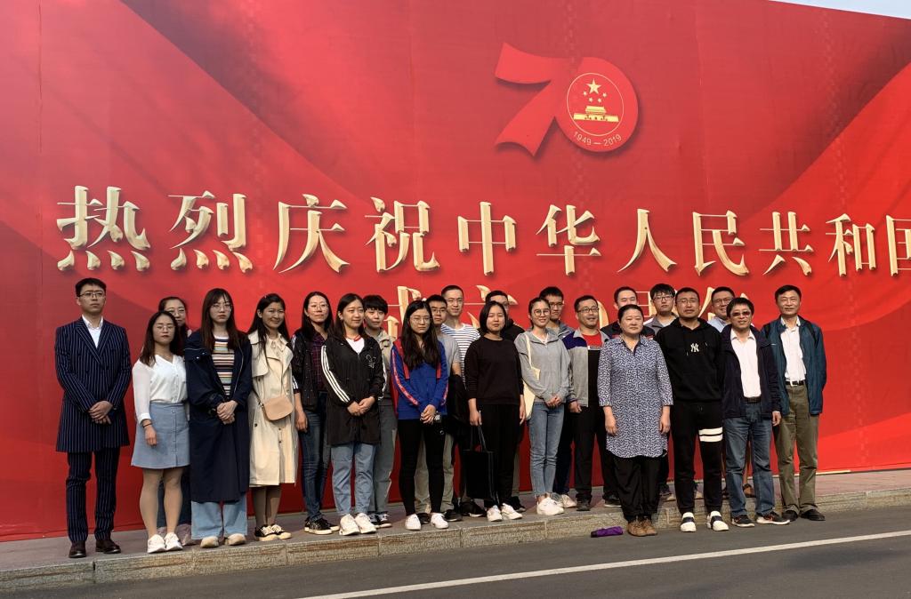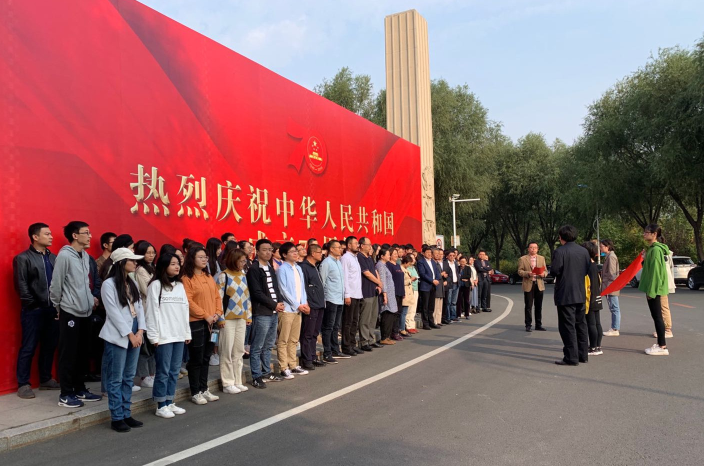 宣誓結束后,黨員們紛紛在東校門的“熱烈慶祝中華人民共和國成立70周年”宣傳板前合影留念。