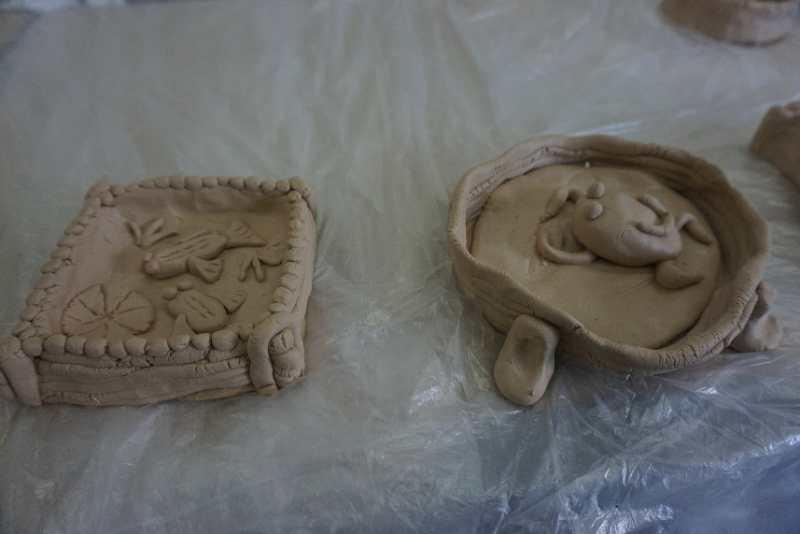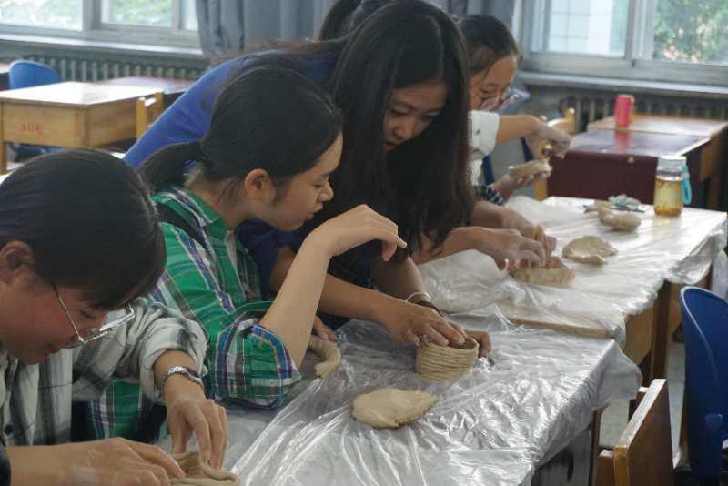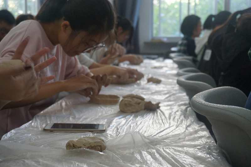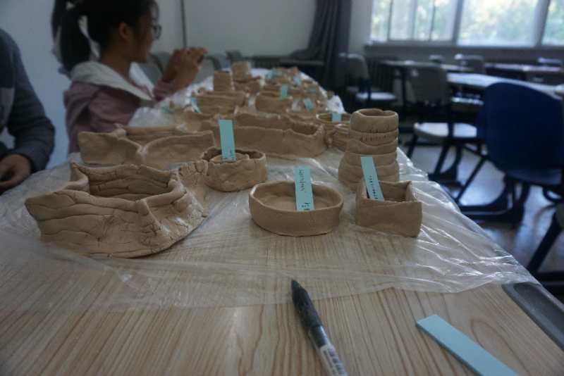 在師兄的分享結(jié)束之后,制陶活動正式開始。由工作人員將事先分裝好的陶泥發(fā)放到每一個同學(xué)的手中,然后大家便開始了對自己手中這塊陶泥的創(chuàng)作。與此同時 在場的工作人員也開始了指導(dǎo)與幫助,而且也會抽空自己動手創(chuàng)作一個作品。陶泥剛拿到手里,同學(xué)們都是毫無頭緒,對著面前這個像面團一樣的東西束手無策。不過經(jīng)過大家一次次的嘗試,大家也逐漸進入了狀態(tài),手中的陶泥也逐漸有了形狀。慢慢的,一個又一個精彩的作品出現(xiàn)在了大家的桌上,引來其他人一陣陣的圍觀驚嘆。漸漸地,教室后側(cè)的課桌上已經(jīng)擺滿了大家各式各樣的作品。在作品上放好標簽后,同學(xué)們便滿懷著成就感離開了活動教室。