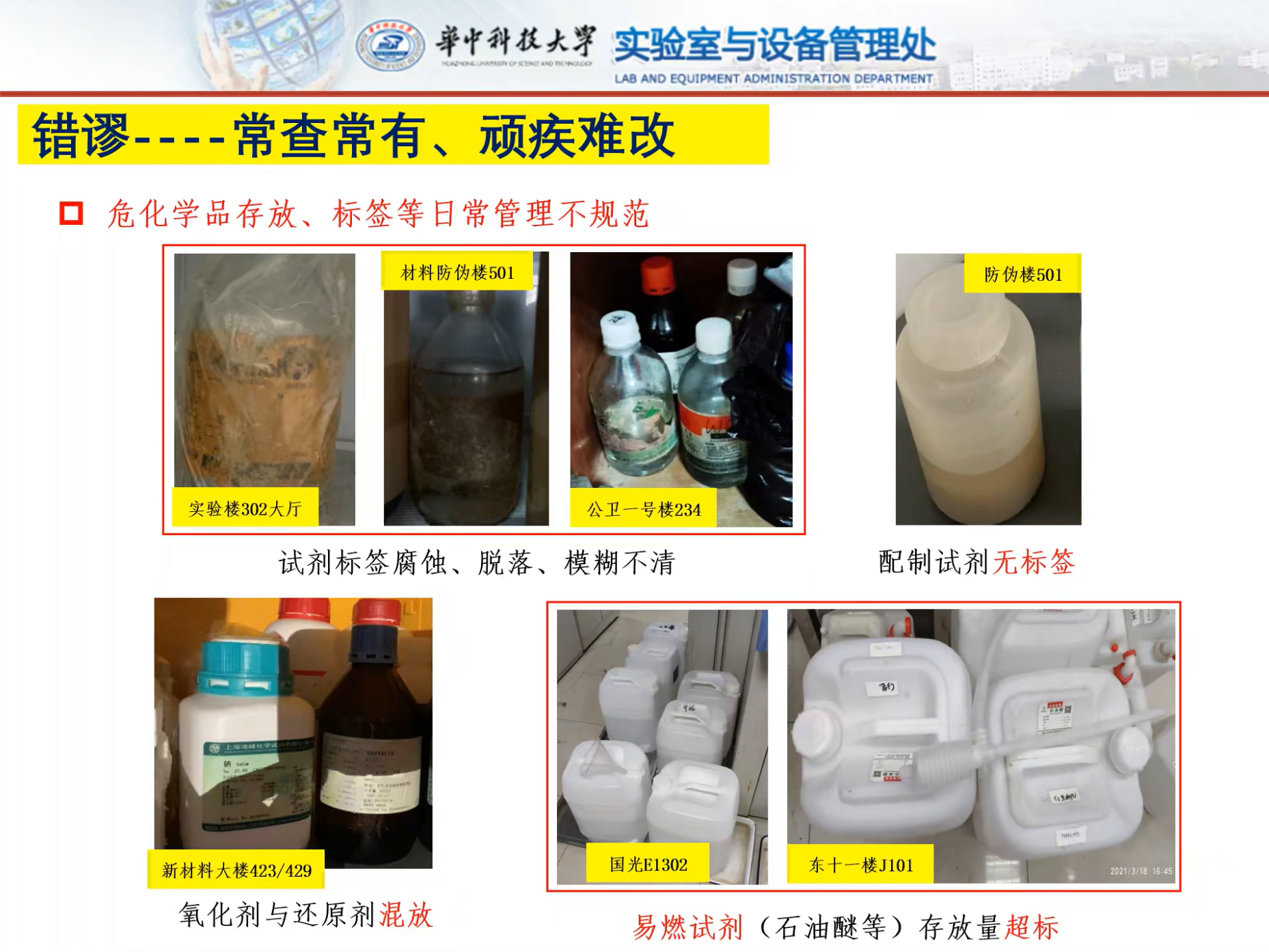 李教授通過分析國內(nèi)外高校實(shí)驗(yàn)室安全事故案例,結(jié)合當(dāng)前高校實(shí)驗(yàn)室安全管理現(xiàn)狀,從“盡職守則、危害識別、風(fēng)險評估、消除隱患、預(yù)防防范”等角度,對實(shí)驗(yàn)室安全管理進(jìn)行了重點(diǎn)論述。在講座中,李教授強(qiáng)調(diào)造成安全事故的主要原因是對安全規(guī)范的不理解、不重視、不習(xí)慣,以及安全監(jiān)管的不完善,并指出高?;瘜W(xué)品管理不嚴(yán)、氣瓶氣路管理不善、廢棄物管理不規(guī)范、水電管理不專業(yè)等實(shí)驗(yàn)室常見的隱患頑疾,呼吁師生從提高安全認(rèn)知入手,互相幫助,共同做好實(shí)驗(yàn)室安全工作。最后,李教授介紹了華中科技大學(xué)先進(jìn)實(shí)驗(yàn)室的優(yōu)秀管理經(jīng)驗(yàn),建議師生從基本的衛(wèi)生值日做起,持之以恒,跬步千里,從對安全心動,到對安全行動。
