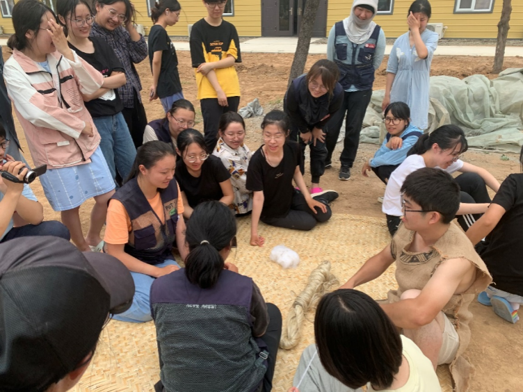 趙里萌老師(穿麻布衣服者)在田野考古實(shí)踐教學(xué)基地為同學(xué)們模擬古人使用陶紡輪的場(chǎng)景