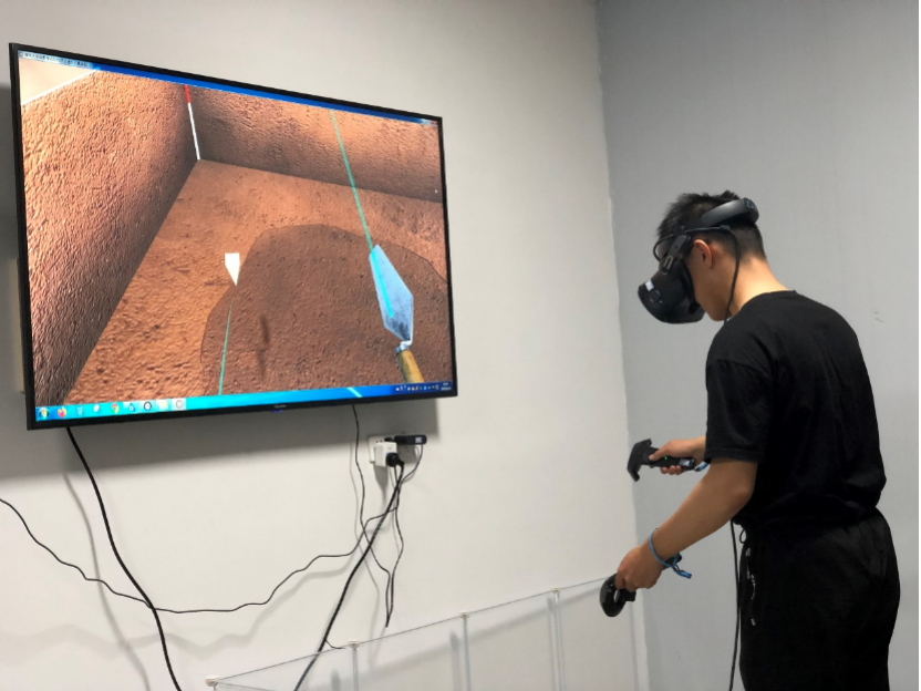 田玉峰同學(xué)佩戴VR設(shè)備通過虛擬仿真實(shí)驗(yàn)課程進(jìn)行田野考古發(fā)掘?qū)W習(xí)