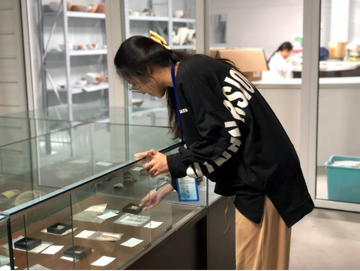 李萌同學(xué)在田野考古基地的文物陳列室布展文物