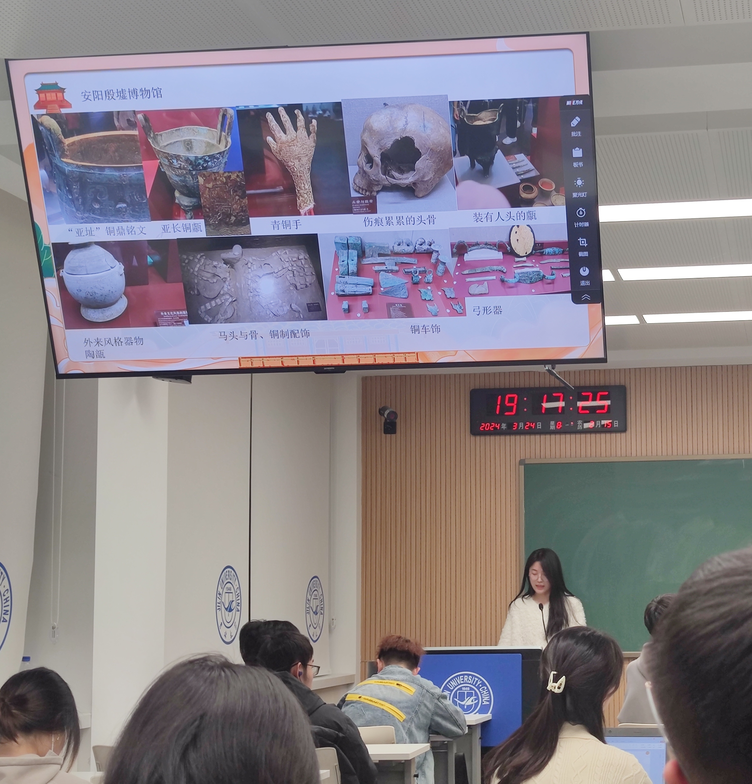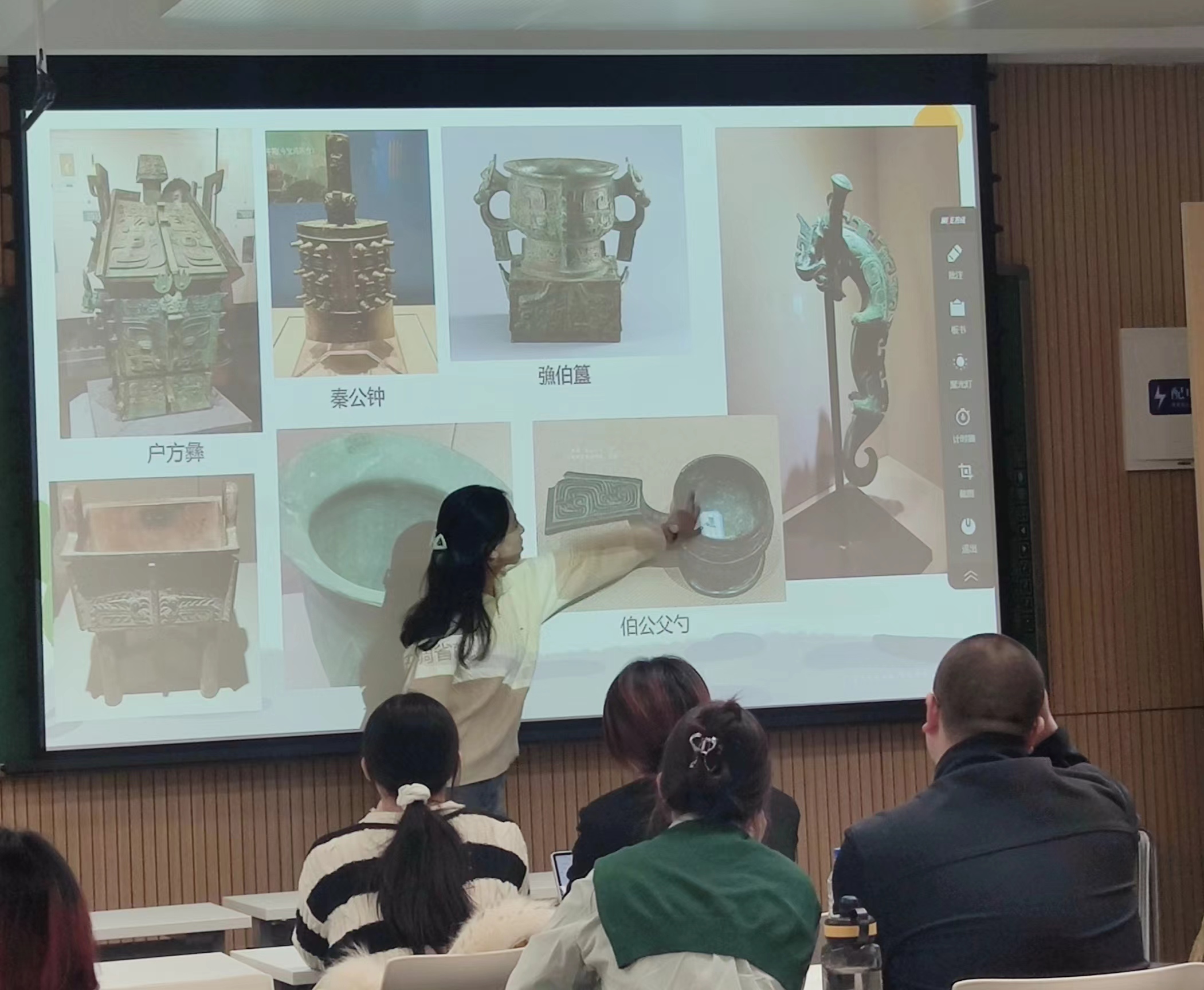 張風(fēng)怡、李盈玉兩位同學(xué)分別就古文字實(shí)習(xí)的上半程和下半程向大家作詳細(xì)介紹。她們將古文字學(xué)專業(yè)歷時(shí)20天,輾轉(zhuǎn)河南、陜西、山西三省,歷經(jīng)鄭州、安陽、西安、寶雞、運(yùn)城、太原六個(gè)城市的實(shí)習(xí)經(jīng)歷娓娓道來。在此期間,他們不僅到各大博物館與考古工作站進(jìn)行了調(diào)研學(xué)習(xí),還與考古、文博專業(yè)的同學(xué)們匯合,交叉學(xué)習(xí)、分享經(jīng)驗(yàn)。