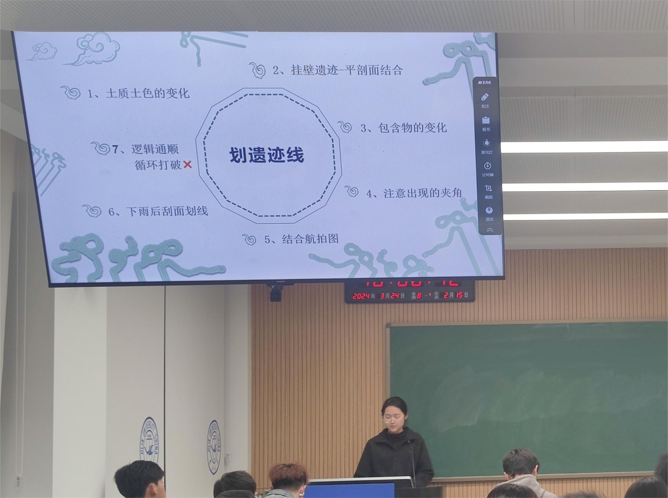 李玉婷分別從學(xué)習(xí)、工作、生活三個(gè)方面向同學(xué)們分享了實(shí)習(xí)生活中的經(jīng)驗(yàn),著重介紹了實(shí)習(xí)過程中野外發(fā)掘、資料整理的相關(guān)流程以及劃遺跡線的方法與注意事項(xiàng)。干貨滿滿的分享讓大家對田野考古工作有了更深入的了解。