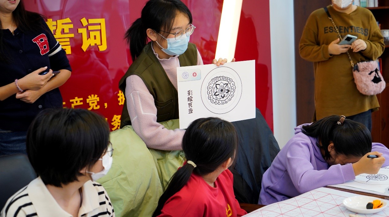 本次活動(dòng)選取了“瓦當(dāng)拓印”作為體驗(yàn)重點(diǎn)?;顒?dòng)開始,梁婉瑩同學(xué)向同學(xué)們介紹了瓦當(dāng)?shù)臍v史背景和精致的紋飾樣式,與同學(xué)們共同欣賞中國(guó)古代建筑中獨(dú)特的藝術(shù)形式與裝飾手法。隨后,同學(xué)們利用發(fā)放的彩繪卡,發(fā)揮想象力與創(chuàng)造力,設(shè)計(jì)出個(gè)性化的瓦當(dāng)圖案,創(chuàng)作出一幅幅色彩絢麗的圖畫。