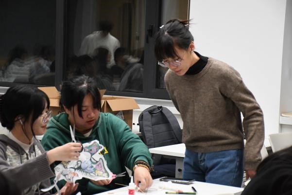 在何濤同學(xué)的宣講之后,活動(dòng)進(jìn)入大家期待已久的風(fēng)箏制作環(huán)節(jié)。風(fēng)箏的制作過(guò)程包括扎骨架、剪風(fēng)箏紙、糊風(fēng)箏、穿繩固定等等,看似簡(jiǎn)單,但做起來(lái)并不容易。大家在文保協(xié)會(huì)成員張?chǎng)?、林彥蓉的帶領(lǐng)下,兩兩合作,從扎骨架開(kāi)始,一步一步將手中零散的材料粘合連接。文保協(xié)會(huì)的其他成員也穿梭在過(guò)道間,為需要指導(dǎo)的同學(xué)提供一對(duì)一的幫助。