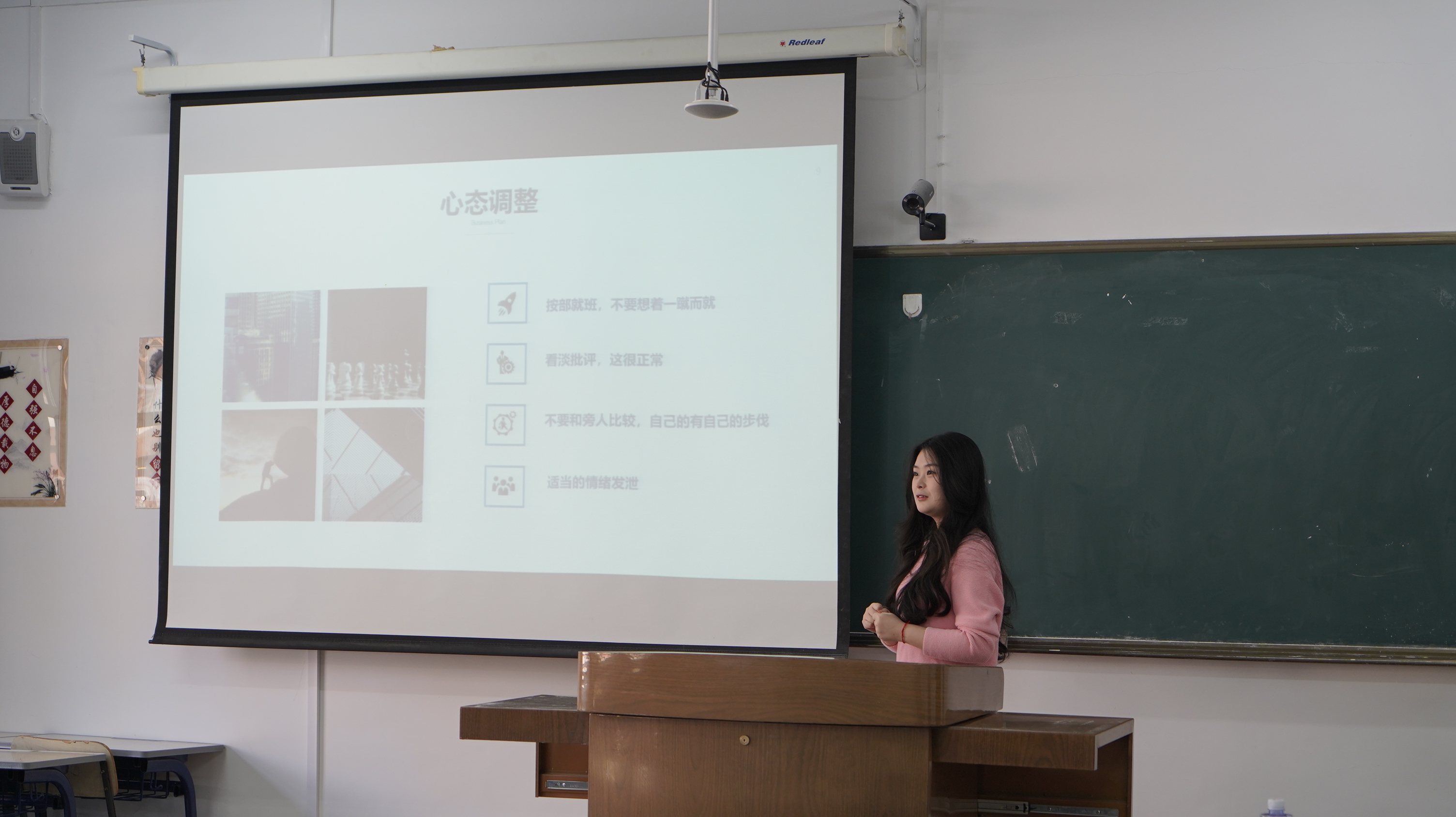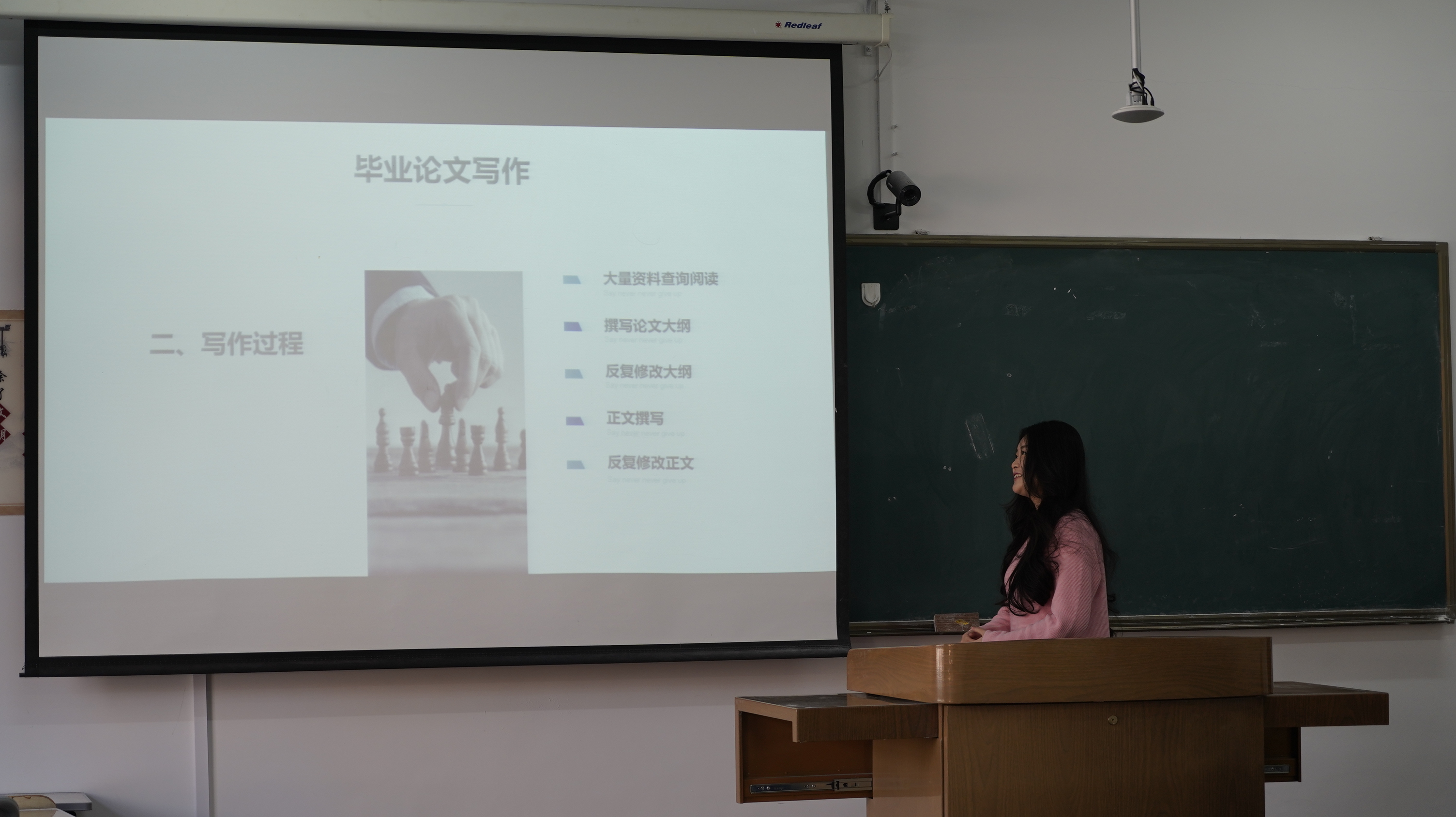 耿默蘭同學(xué)以自我介紹入題,從畢業(yè)論文與學(xué)習(xí)生活兩個(gè)板塊進(jìn)行分享。在畢業(yè)論文寫作建議中,耿默蘭同學(xué)首先介紹了準(zhǔn)備工作,將其分為選題、導(dǎo)師選擇和目標(biāo)規(guī)劃三步。其次將寫作過程分為大量資料查閱、撰寫論文大綱、反復(fù)修改大綱正文、撰寫和反復(fù)修改正文五個(gè)階段,并以自己的論文目錄為例進(jìn)行闡明。最后,在心態(tài)調(diào)整階段,提出按部就班、正確看待批評(píng)、不與旁人比較和適當(dāng)?shù)那榫w發(fā)泄四條建議。在第二板塊學(xué)習(xí)生活中,耿默蘭同學(xué)根據(jù)自身本科四年的學(xué)習(xí)經(jīng)歷,向同學(xué)們提出興趣、技能、能力、活動(dòng)四方面寶貴而精煉的意見,鼓勵(lì)同學(xué)們做好眼前的事,最后寄語(yǔ)同學(xué)們:“每個(gè)人都有自己的選擇,只要不后悔,就是最好的選擇?!?/span>