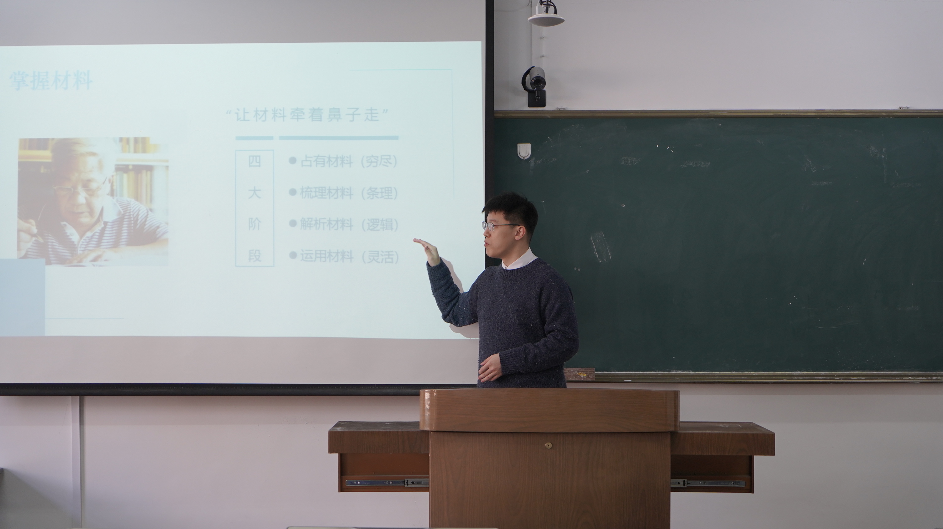 田玉峰同學(xué)以“學(xué)而思之,行以致遠(yuǎn)”的總標(biāo)題開篇,從寫作流程,文獻(xiàn)綜述,具體研究,論文構(gòu)成和論文修改五個(gè)方面向同學(xué)們進(jìn)行具體介紹。田玉峰同學(xué)首先展示了畢業(yè)論文寫作的基本流程及選題分類與標(biāo)準(zhǔn),并將標(biāo)準(zhǔn)總結(jié)為“適當(dāng)”兩個(gè)字。其次,引用張忠培先生的話“讓材料牽著鼻子走”,提出掌握材料的四大階段。再次,提出論文的組織基礎(chǔ):理論方法范式到實(shí)踐,并具體闡釋了理論與方法的區(qū)別。接著,將論文構(gòu)成簡(jiǎn)要概括為名、文、圖、表、注,提出框架、內(nèi)容和邏輯三方面,并傳授模仿的技巧。田玉峰同學(xué)還強(qiáng)調(diào)了修改的重要性,提出重復(fù)的意義與追求完美的意識(shí)。之后以自己的畢業(yè)論文為例,設(shè)身處地的對(duì)以上步驟進(jìn)行舉例。最后,田玉峰同學(xué)以學(xué)思篤行寄語(yǔ)同學(xué),對(duì)如何度過充實(shí)的大學(xué)生活提出建議,希望大家做到學(xué)而思之、思而行之、行而再學(xué)。