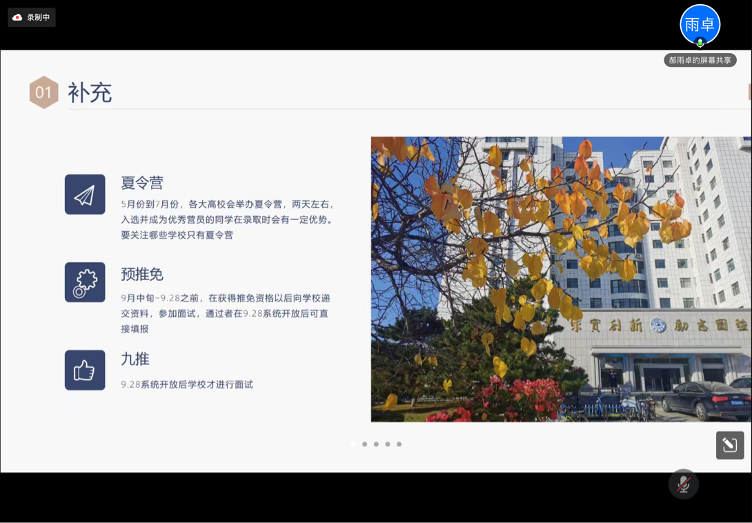 保研至北京師范大學的郝雨卓同學為大家講解了不同保研途徑之間的差異,并根據(jù)自身情況就推免吉林大學以及北京師范大學的時間流程進行了詳細的介紹。她指出同學們應(yīng)該關(guān)注一些只有夏令營一種保研途徑的學校,并針對各個學校的政策合理充分地做好準備。