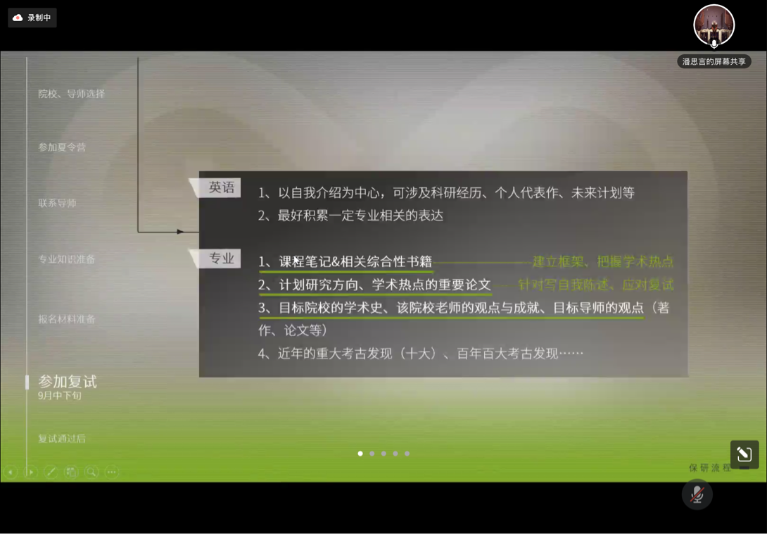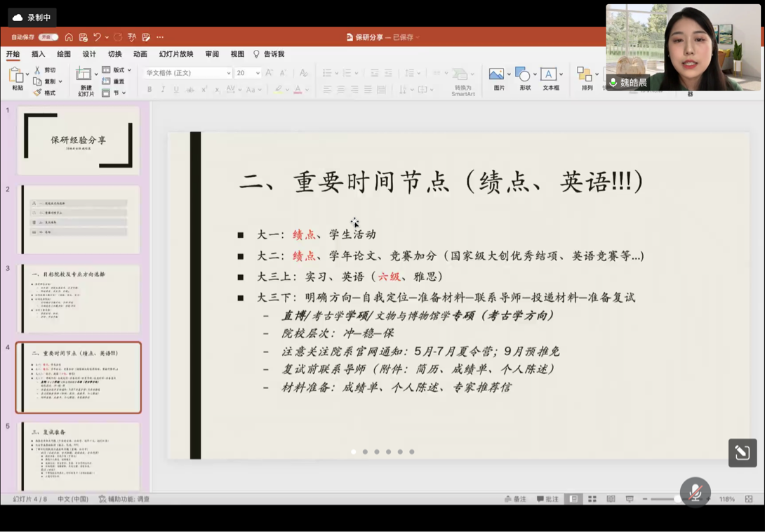 考古專業(yè)最后一名分享人是保研至中國社會科學院大學的魏皓晨同學。她告訴同學們要明確自己的興趣方向,這有利于大家選擇目標院校及導(dǎo)師。隨后,她列出大一至大三學習生活中的幾個重要時間節(jié)點,著重強調(diào)了英語的重要性。