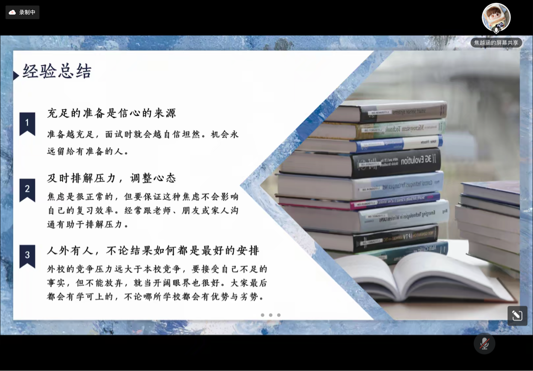 最后一位分享人是保研至復(fù)旦大學的焦越涵。她告訴大家要及時進行面試總結(jié),根據(jù)需要對自己準備的內(nèi)容進行補充。她還針對面試出題角度進行了詳細講解,提醒大家要充分了解自己提交的資料。最后,她也勉勵大家,良好的心態(tài)和充分的準備是很重要的,不論結(jié)果如何都是最好的安排。