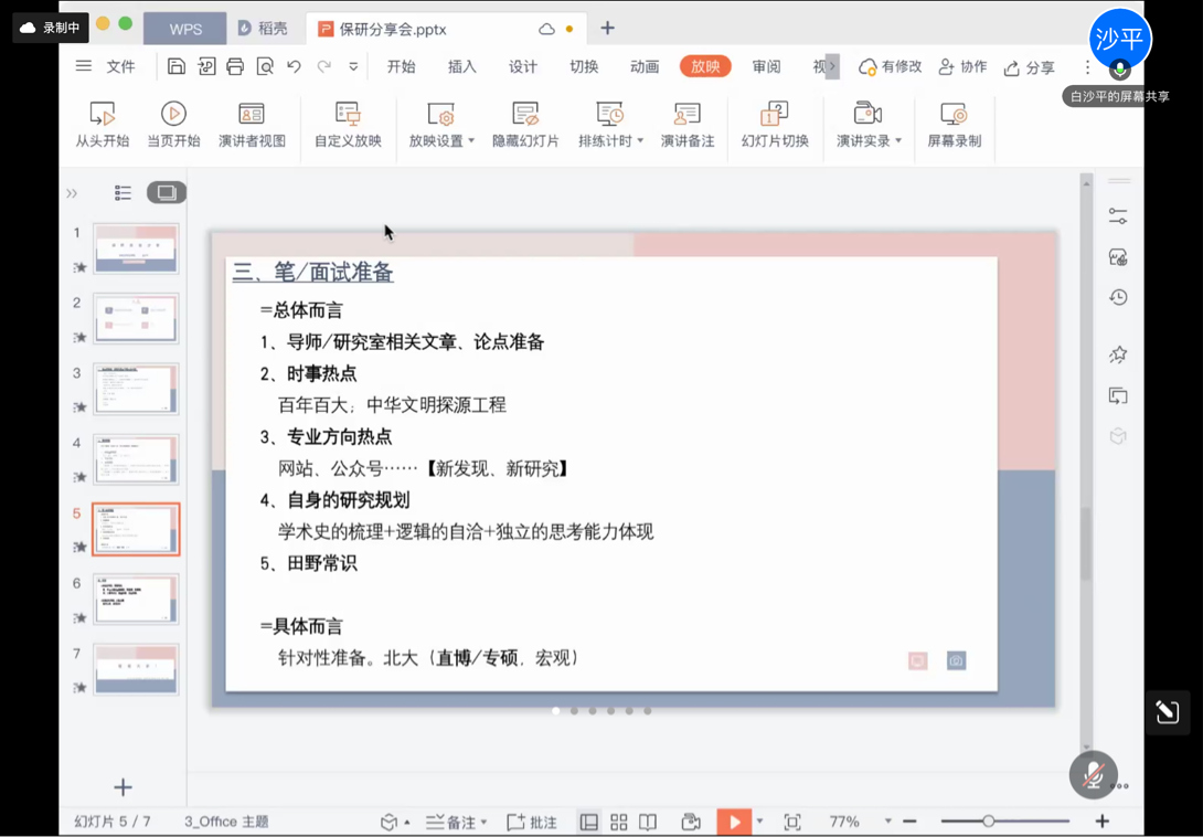 又是一年收獲季,金秋九月,不少優(yōu)秀的師兄師姐順利保研至理想院校。為了讓同學們更加充分地了解保研信息,增強學習動力,合理規(guī)劃學業(yè),2022年10月30日下午,太陽成集團tyc151cc學生會科研學術(shù)部成功舉辦了“青苗計劃——太陽成集團tyc151cc保研專場分享會”。本次分享會由涂曉悅同學主持,邀請了已經(jīng)成功保研的2019級考古學專業(yè)的張垚、潘思言、白沙平、魏皓晨同學以及文物與博物館學專業(yè)的張靈江、郝雨卓、焦越涵同學進行分享。七位同學結(jié)合自己的保研經(jīng)歷,分別就保研的準備工作、申報流程、面試經(jīng)驗等方面進行了交流。