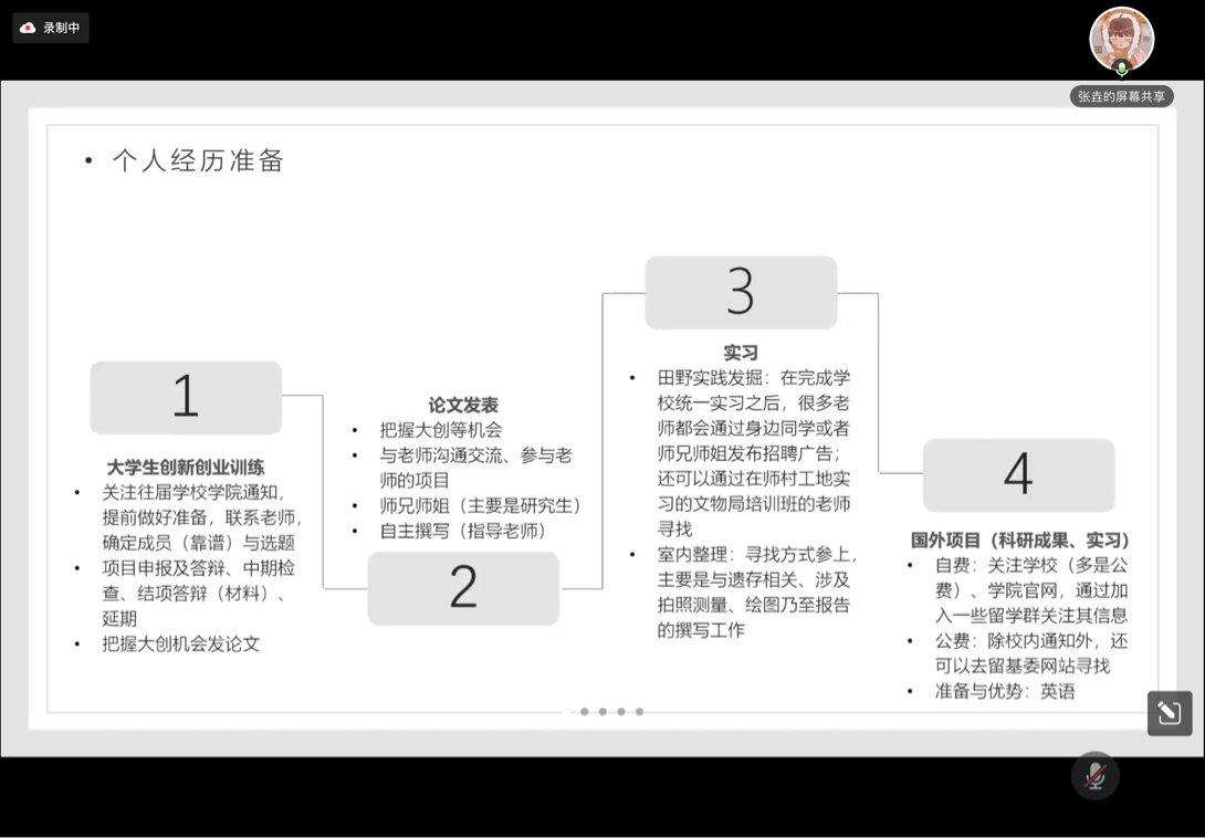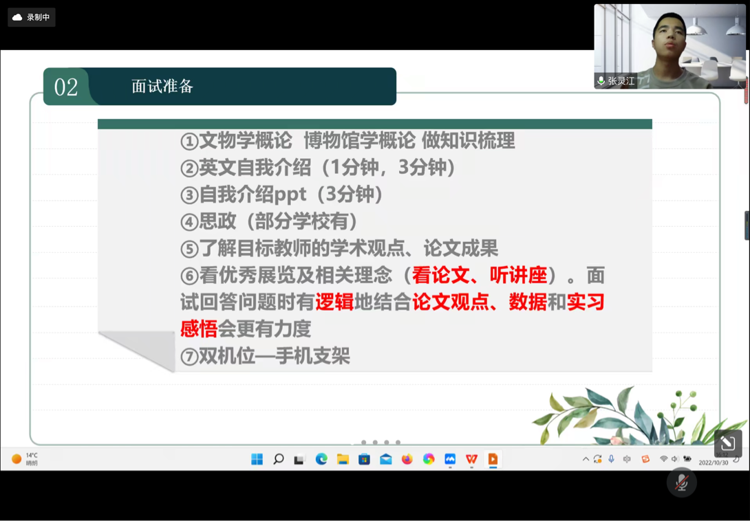 接下來是文博專業(yè)的保研分享。首先是張靈江同學對于保研本校具體要求的介紹。針對文博專業(yè)面試中的專業(yè)課提問,他將需要的工作分成兩部分,一部分是“早準備、少而精”的有關(guān)基礎(chǔ)能力的內(nèi)容,另一部分是“就近準備、多了解”的一些拓展內(nèi)容,系統(tǒng)分析了需要準備的主要材料。