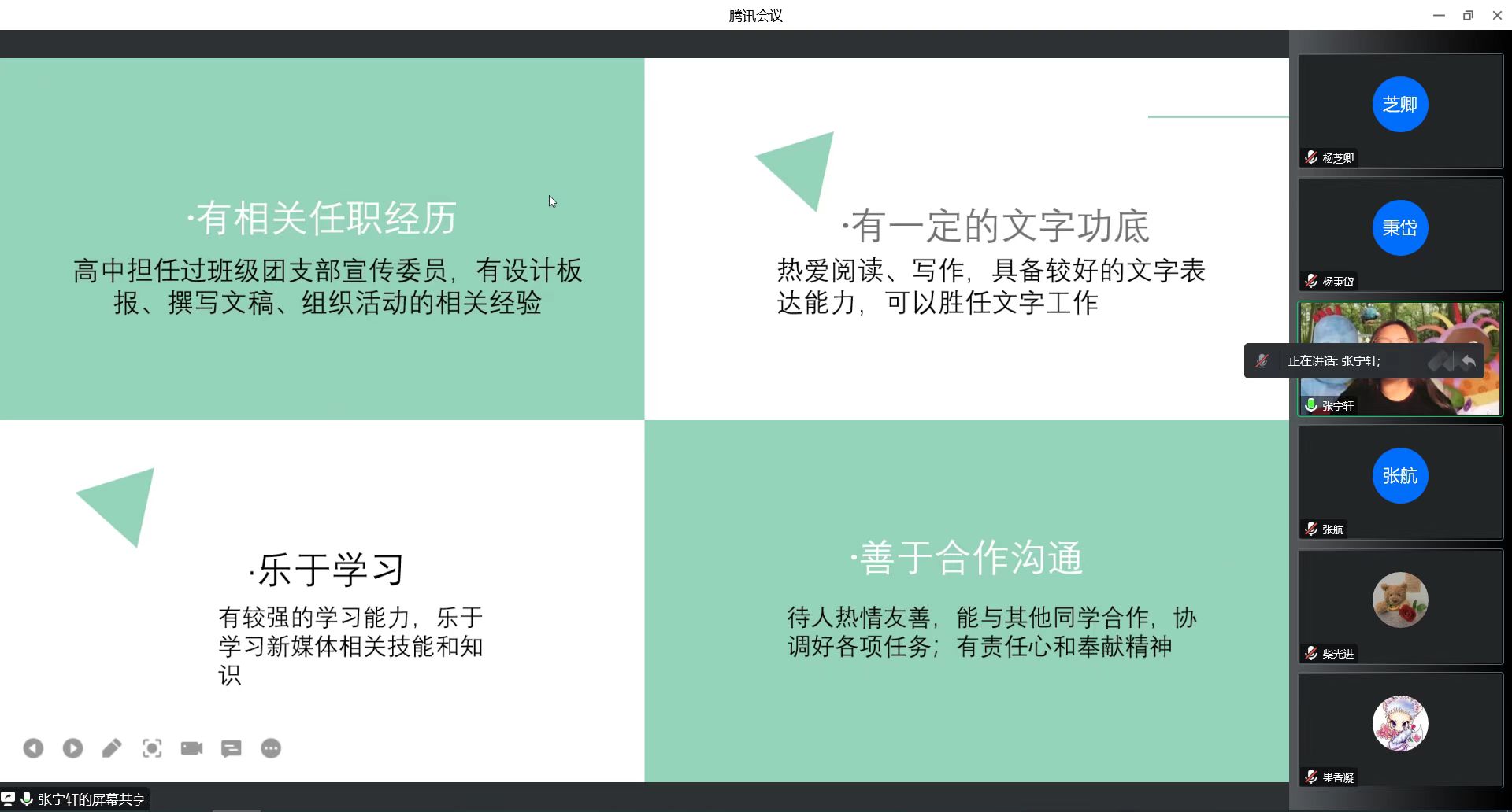 根據(jù)當(dāng)前學(xué)校的相關(guān)防疫政策,本次納新面試通過(guò)騰訊會(huì)議于線上舉行 。為保障納新過(guò)程順利進(jìn)行,團(tuán)學(xué)組織相關(guān)負(fù)責(zé)人針對(duì)本年度報(bào)名情況制定出合理的考核方式和考核標(biāo)準(zhǔn),向各納新部門(mén)征集面試問(wèn)題,并召開(kāi)線上會(huì)議進(jìn)行面試官培訓(xùn)。上午9時(shí),參與面試的同學(xué)按照編號(hào)順序,依次進(jìn)入等候室和會(huì)議室進(jìn)行面試。本次面試分為自我介紹和個(gè)人答辯兩個(gè)環(huán)節(jié)。參加的同學(xué)首先通過(guò)PPT等形式,分別從個(gè)人簡(jiǎn)介、崗位認(rèn)識(shí)、競(jìng)選優(yōu)勢(shì)、工作設(shè)想等方面進(jìn)行時(shí)長(zhǎng)三分鐘的競(jìng)選演講。在此環(huán)節(jié)中,每位同學(xué)都充分展示了自己在性格、能力、工作經(jīng)驗(yàn)等方面的競(jìng)選優(yōu)勢(shì),不吝表達(dá)了對(duì)所報(bào)名的職務(wù)的工作任務(wù)的設(shè)想與規(guī)劃,盡顯為學(xué)院奉獻(xiàn)、為同學(xué)服務(wù)的決心和對(duì)后續(xù)工作的展望。在隨后的個(gè)人答辯環(huán)節(jié),面試官結(jié)合同學(xué)們的自我陳述內(nèi)容和競(jìng)選崗位的工作內(nèi)容及特點(diǎn),向同學(xué)們有針對(duì)性地提出了一些問(wèn)題,引導(dǎo)同學(xué)們重新思考工作與學(xué)習(xí)的關(guān)系、協(xié)同工作的意義等關(guān)鍵問(wèn)題。通過(guò)時(shí)長(zhǎng)一分鐘的答辯,面試官進(jìn)一步加深了對(duì)競(jìng)選者的了解,同學(xué)們也對(duì)團(tuán)學(xué)組織有了更深刻的認(rèn)識(shí)。整個(gè)面試流程中,應(yīng)試同學(xué)和面試官緊密配合,每位同學(xué)之間銜接有序,共同取得了良好效果。中午12時(shí)30分,納新面試圓滿結(jié)束。