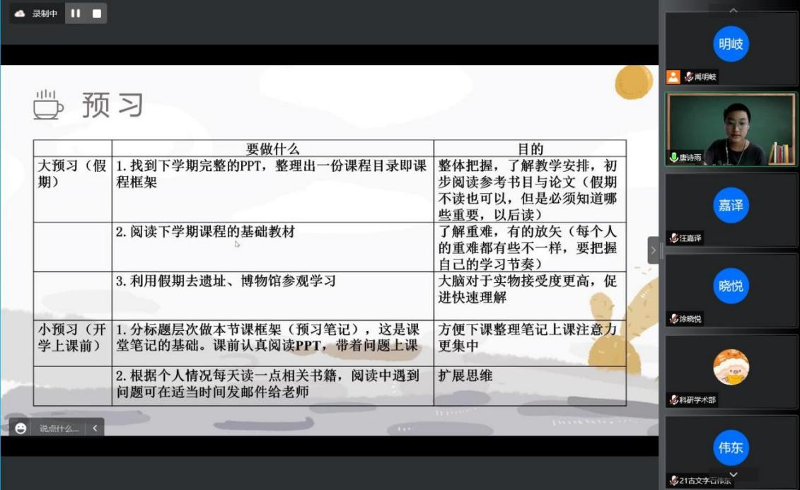 首先,唐詩雨同學從英語分級考試,專業(yè)課程,學習方法,課余時間四個方面展開闡述。唐詩雨同學建議新生們要好好復習英語并為新生以后的英語學習提供了建議。同時,唐詩雨同學著重強調(diào)了改變學習方法的重要性。鼓勵新生打破僵化的思維習慣,培養(yǎng)自學能力。并從個人經(jīng)驗出發(fā)向新生推薦了考古方向的公眾號,網(wǎng)站等學習資源。