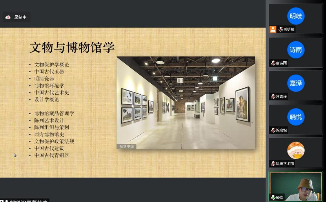 接下來,郭曉同學從文博專業(yè)角度出發(fā),向新生詳細介紹了文物與博物館學的概念和相關課程。隨后郭曉同學推薦了《博物館里的極簡中國史》、《博物館藏品管理學》等經(jīng)典書目以及《我在故宮修文物》、《國家寶藏》等優(yōu)秀紀錄片。并在新生日常生活如自習空間,社團,團學組織等方面提供了許多寶貴的建議。相信郭曉同學風趣幽默的講解會給剛剛步入大學的新生們帶來很大的幫助。