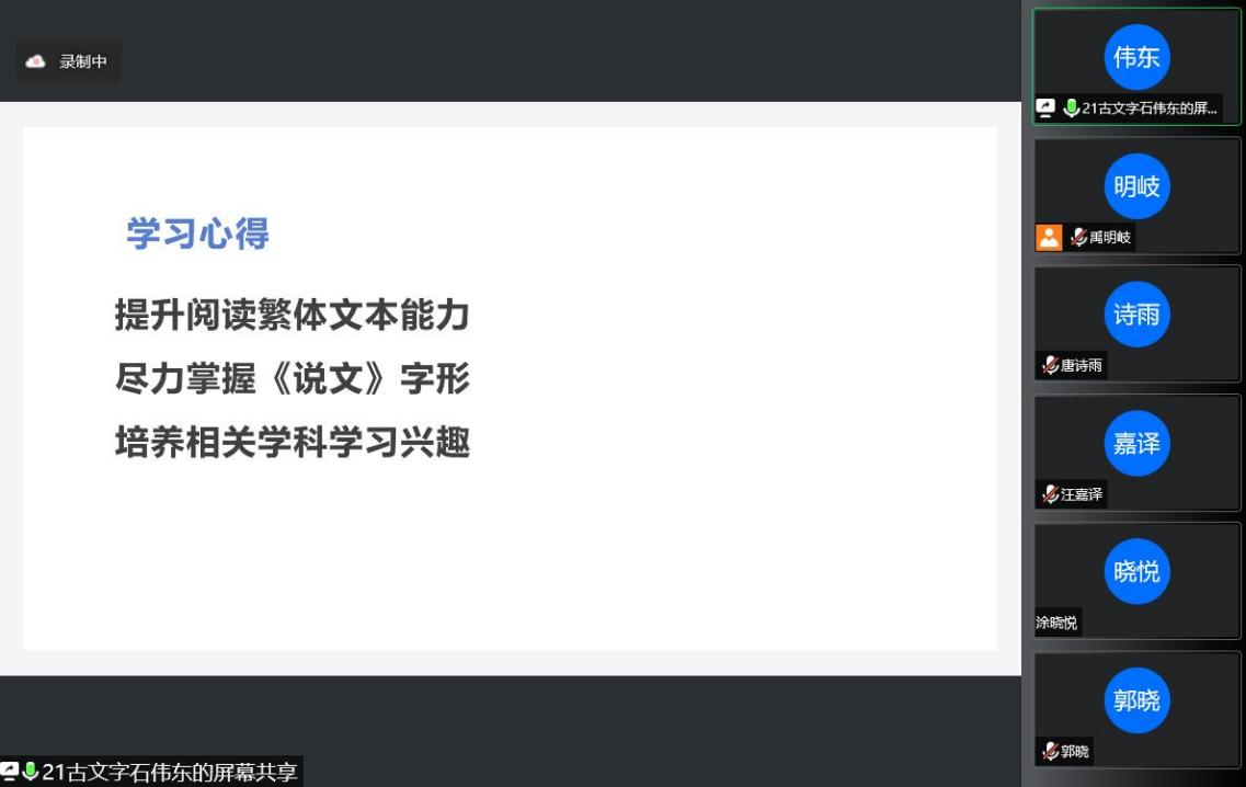 最后,石偉東同學在介紹專業(yè)課程的組成后,從提升閱讀繁體文本能力,盡力掌握《說文》字形,培養(yǎng)相關學科學習興趣三個方面分享了自己的學習心得。推薦了《古文字學初階》、《中國古文字學通論》等專業(yè)書籍并進行詳細介紹。從石偉東同學細致耐心的講解中,想必新生們能夠感受到古文字學的魅力。