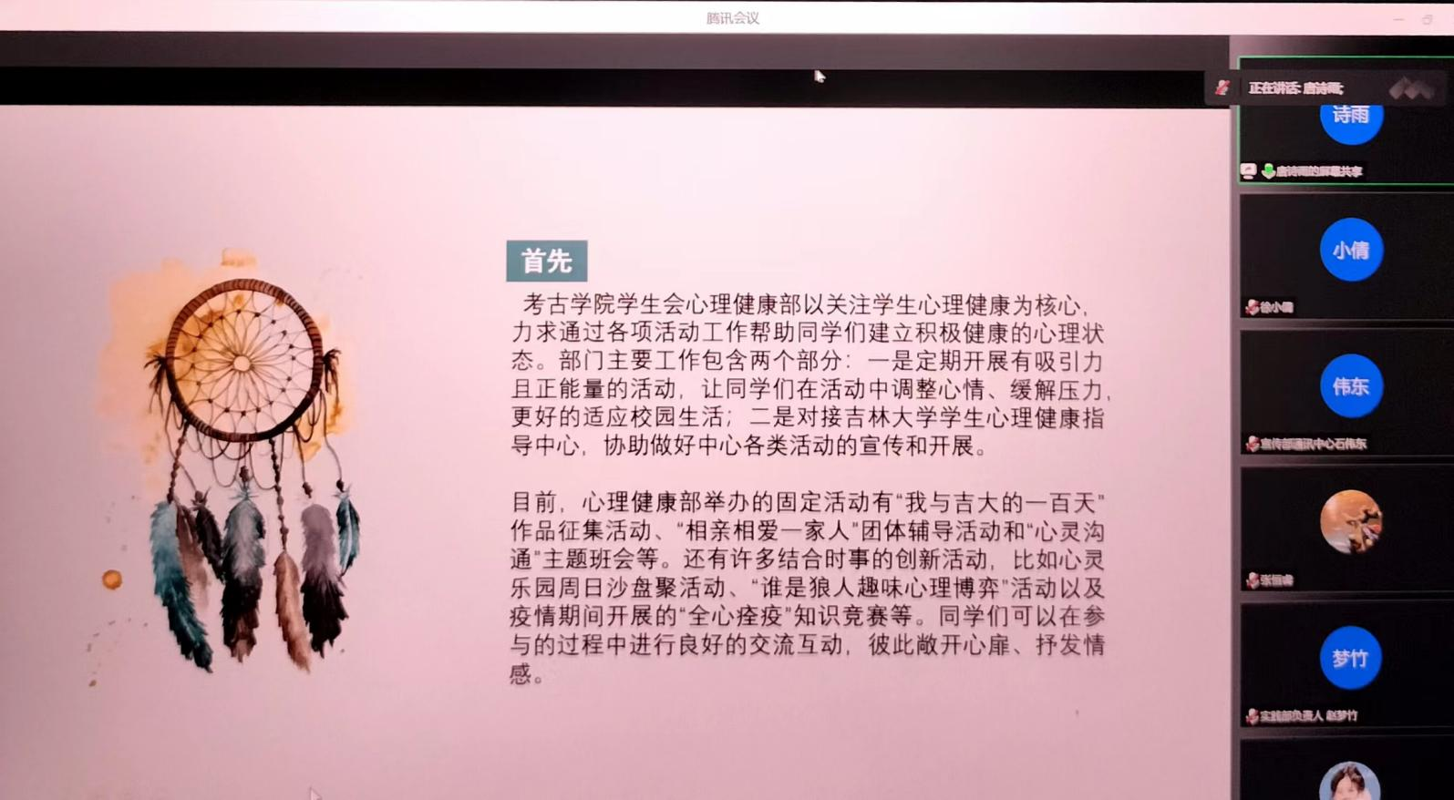 接下來,學(xué)生會的四位部門負(fù)責(zé)人圍繞學(xué)生會服務(wù)同學(xué)的宗旨,面向同學(xué)全面發(fā)展的個人需求,進(jìn)行各具特色的學(xué)生會部門介紹。學(xué)生會主席團(tuán)成員兼心理健康部負(fù)責(zé)人唐詩雨介紹了部門舉辦的固定活動和創(chuàng)新活動,說明了部門關(guān)注學(xué)生心理健康的核心任務(wù);學(xué)生會主席團(tuán)成員兼校園文化部負(fù)責(zé)人張航介紹了部門一年來舉辦和合作舉辦的各項文體活動,展現(xiàn)了部門在豐富同學(xué)校園生活方面的導(dǎo)向作用;綜合事務(wù)部負(fù)責(zé)人吳芊妤介紹了部門承擔(dān)的檔案、活動經(jīng)費(fèi)等方面的記錄上報任務(wù),點(diǎn)出了部門承擔(dān)的后勤保障工作;科研學(xué)術(shù)部負(fù)責(zé)人陳嘉琦介紹了部門組織的形式多樣的學(xué)習(xí)、學(xué)術(shù)分享活動,講述了部門活動幫助同學(xué)適應(yīng)學(xué)習(xí)生活、迎接學(xué)習(xí)挑戰(zhàn)的重要目的。