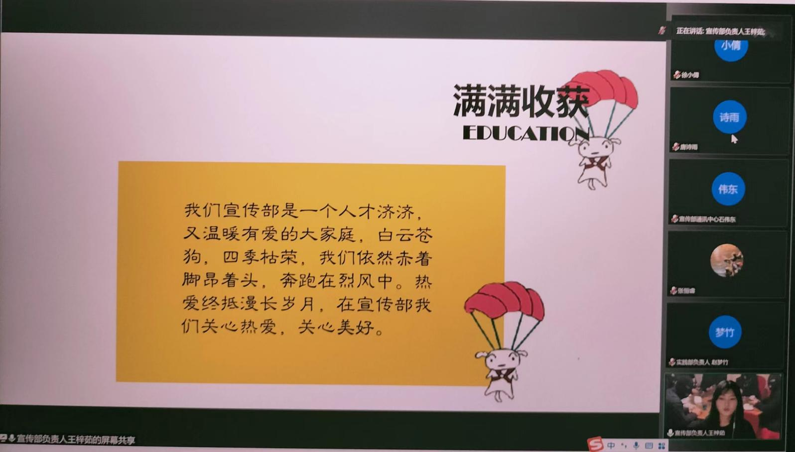 隨后,團(tuán)委各部門負(fù)責(zé)人以部門過去一年的具體工作經(jīng)歷為主線,結(jié)合自己的工作感受,展開了部門介紹。辦公室負(fù)責(zé)人于涵宇介紹了辦公室在團(tuán)建、團(tuán)課中協(xié)調(diào)各方的重要作用和在制定活動計劃、加強(qiáng)思想建設(shè)等方面的特殊作用;組織部負(fù)責(zé)人鐘孟躍說明了部門主要負(fù)責(zé)的團(tuán)組織建設(shè)、團(tuán)員教育管理工作,以及完成上述工作所需的認(rèn)真細(xì)致等特質(zhì);實(shí)踐部負(fù)責(zé)人趙夢竹講述了部門組織社會實(shí)踐、傳達(dá)實(shí)踐信息等工作內(nèi)容,展現(xiàn)了工作中培養(yǎng)的社會責(zé)任感;宣傳部負(fù)責(zé)人王梓茹分別介紹了通訊中心、新媒體中心在宣傳工作中承擔(dān)的任務(wù),彰顯了宣傳部體量大、任務(wù)多的特點(diǎn),鼓勵對攝影、撰文感興趣的同學(xué)加入。