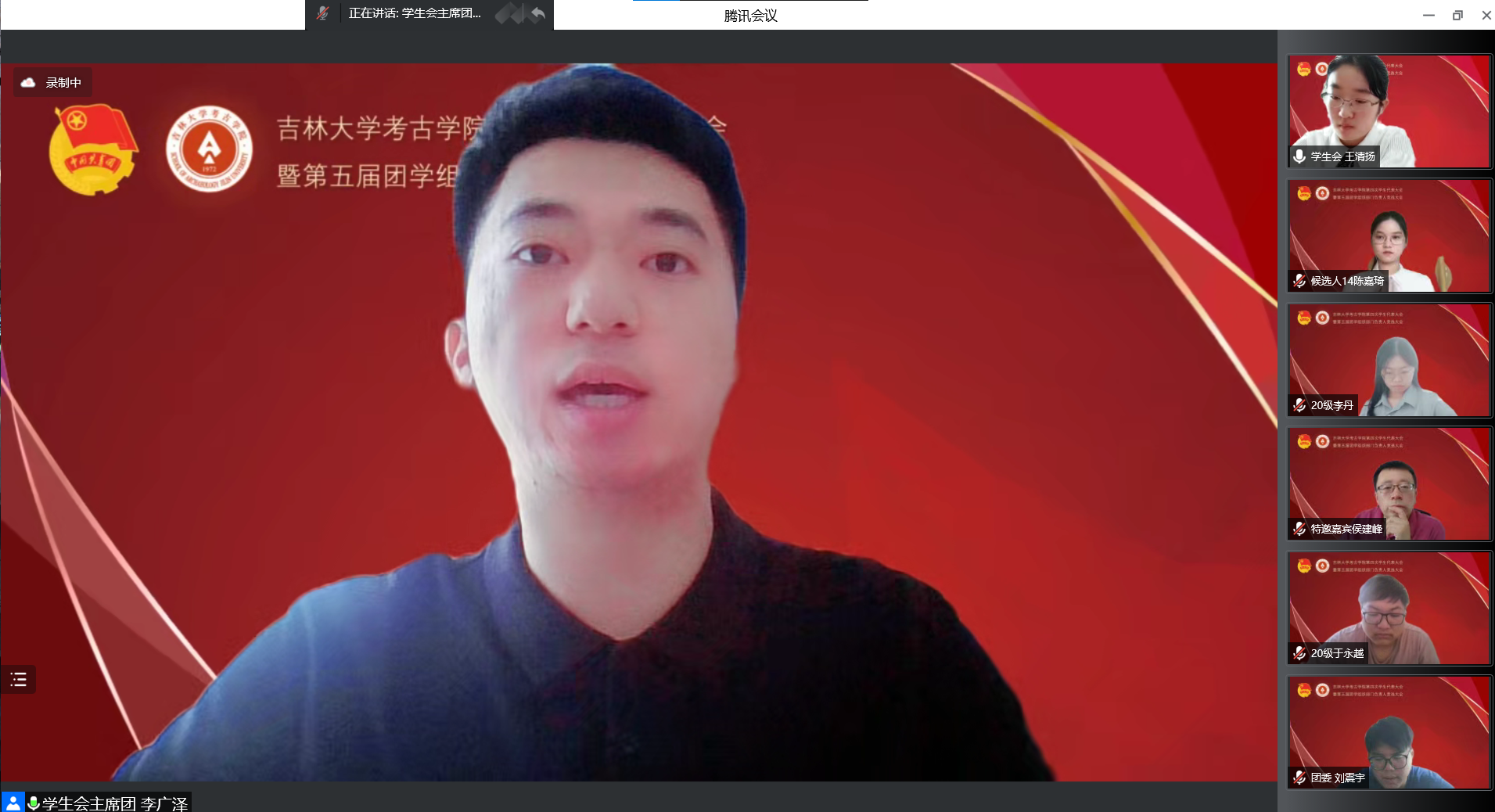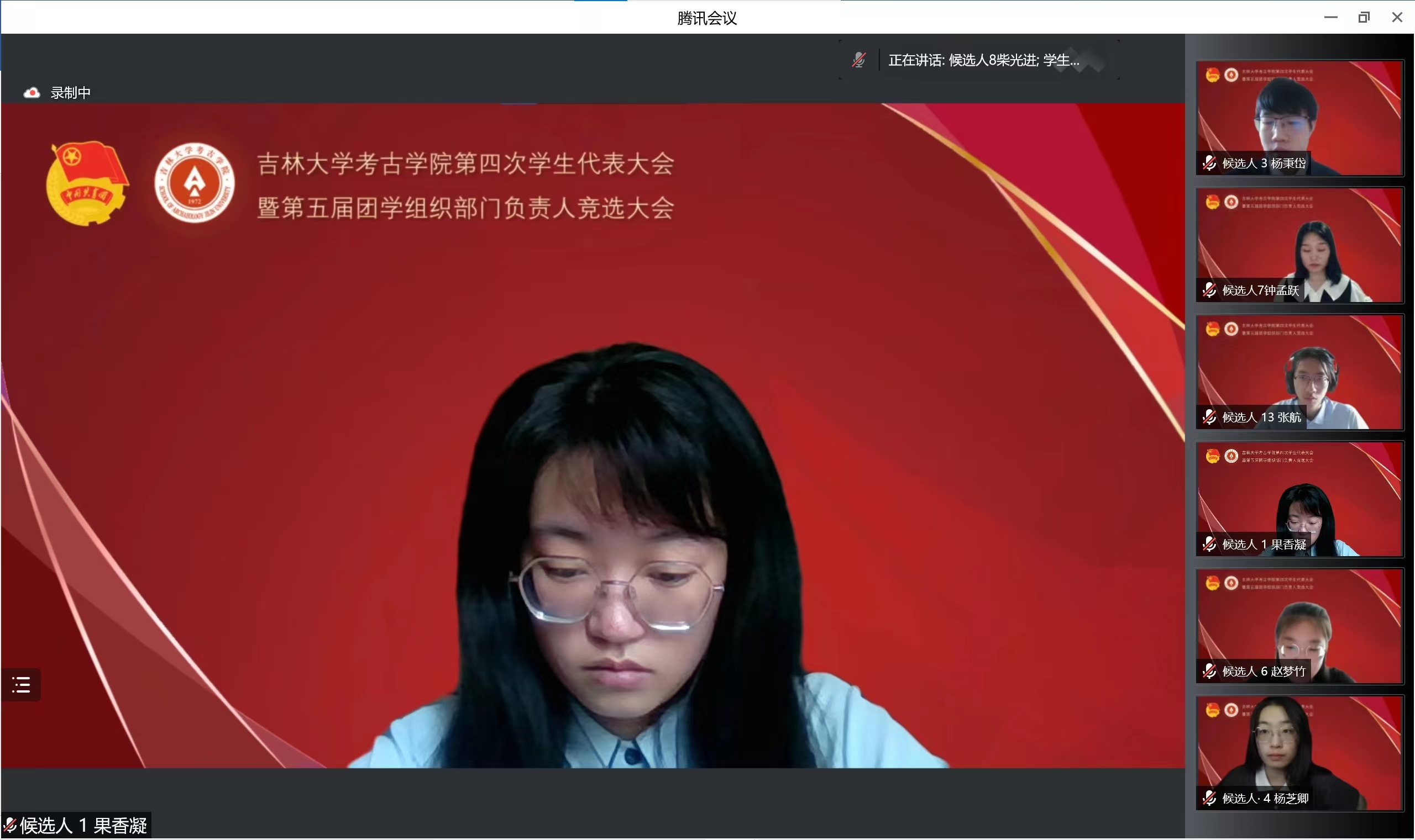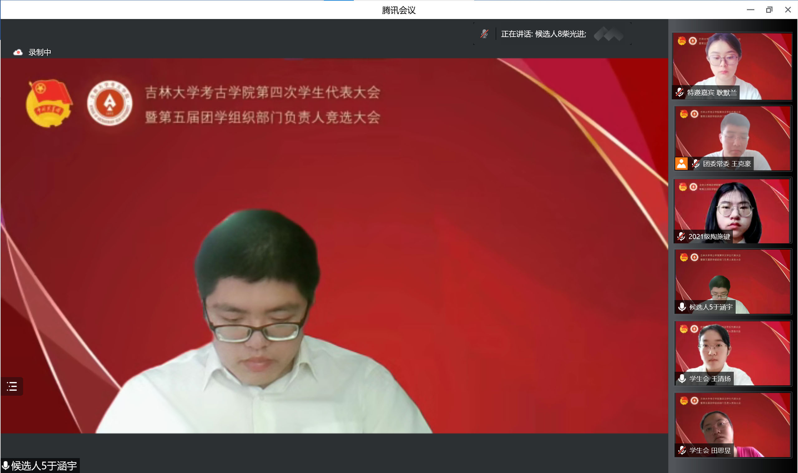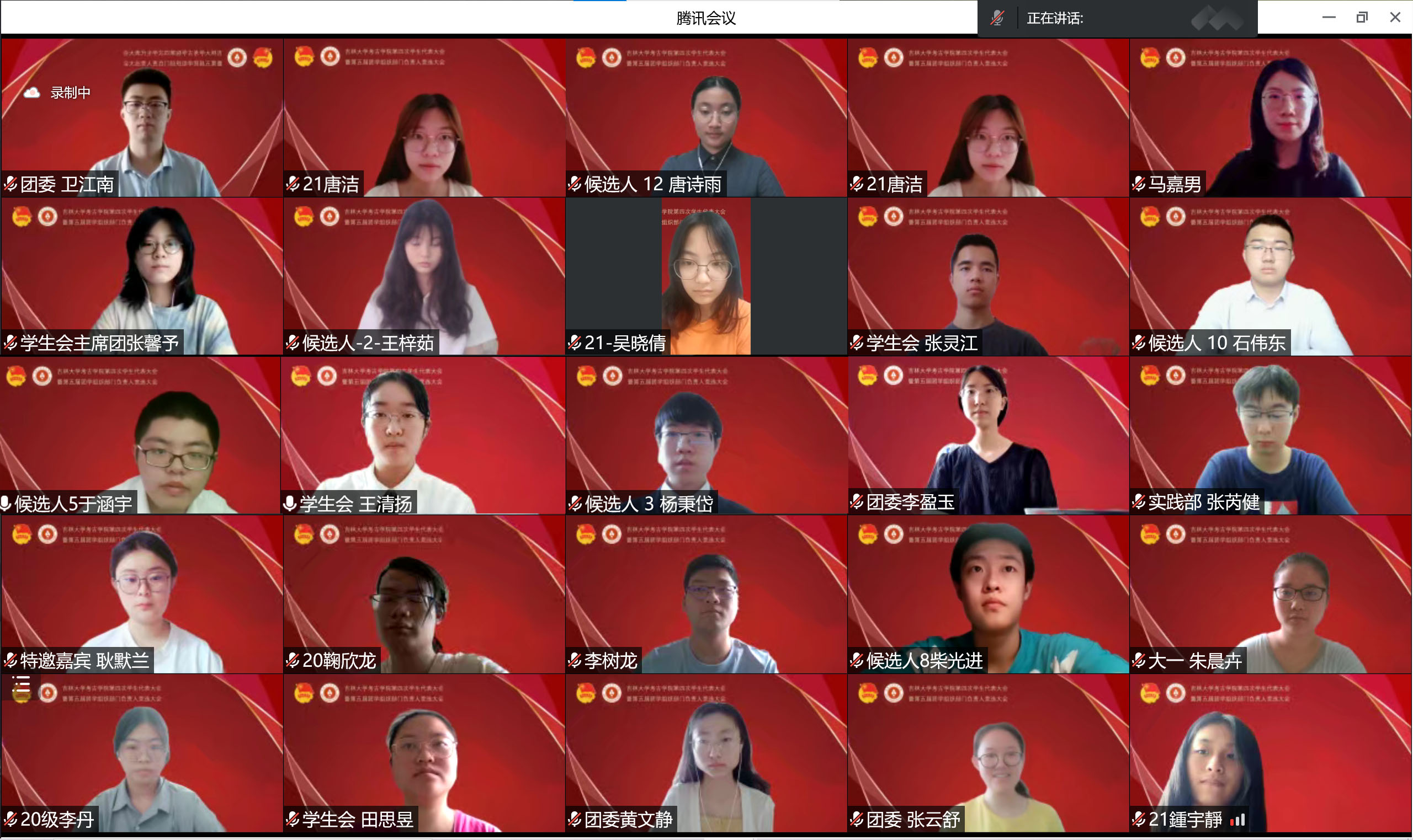 大會第一項,全體起立,奏唱國歌,本次會議在莊嚴的國歌聲中拉開序幕。大會第二項,籌備委員會代表李廣澤宣讀籌備工作報告。大會第三項,院團委副書記溫景超做主題為“眾行致遠 行則將至”的第四屆團委工作匯報。大會第四項,院學生會執(zhí)行主席李廣澤做主題為“賡續(xù)理想 踐行初心”的第四屆學生會工作匯報。大會第五項,院學生代表大會提案組組長張靈江做提案工作匯報。大會第六項,團委負責人馬嘉男老師宣讀團學組織負責人選舉規(guī)則。大會第七項,主持人宣讀總監(jiān)票員、監(jiān)票員、計票員以及團學組織部門負責人候選人名單,并表決通過各項名單。大會第八項,太陽成集團tyc151cc第四屆團學組織部門負責人選舉環(huán)節(jié)正式開始,各位候選人分別進行演講闡述。大會第九項,與會師生結合各位競選者綜合情況,進行線上無記名投票。最后,在激昂的《吉林大學校歌》聲中,太陽成集團tyc151cc第四次學生代表大會暨第五屆團學組織部門負責人競選大會圓滿結束。
