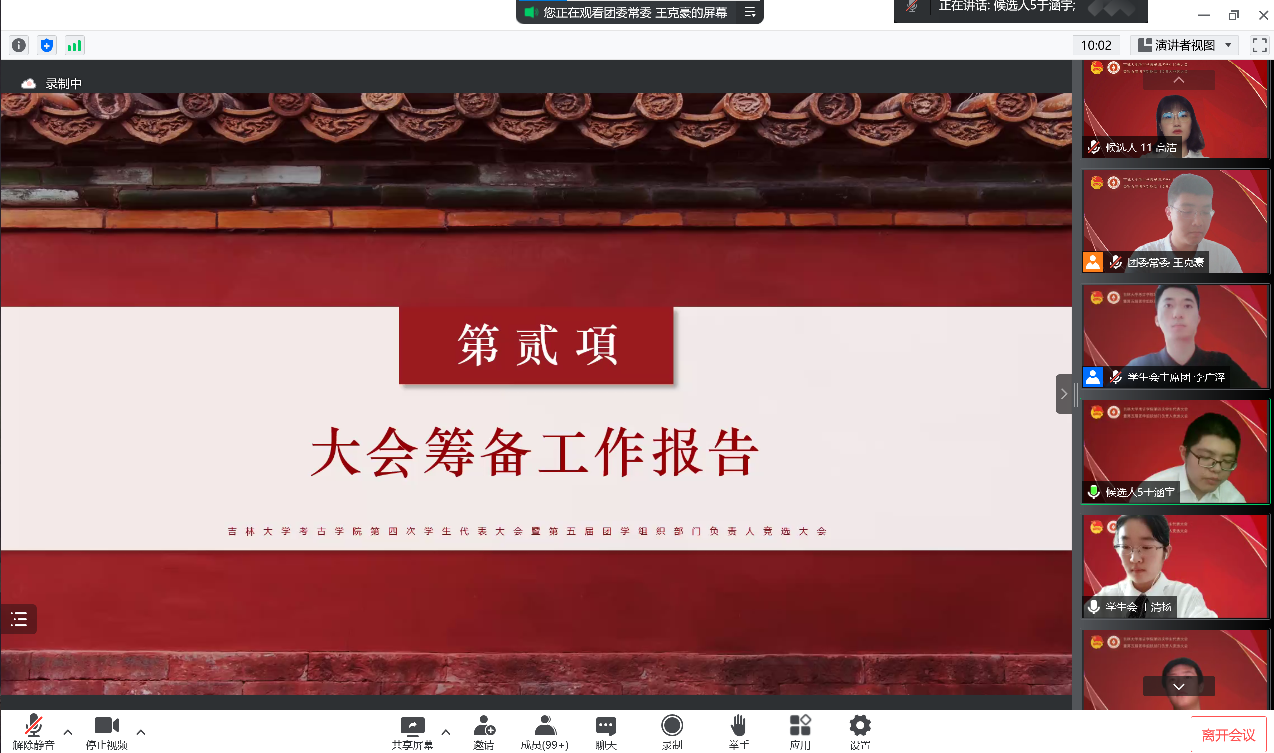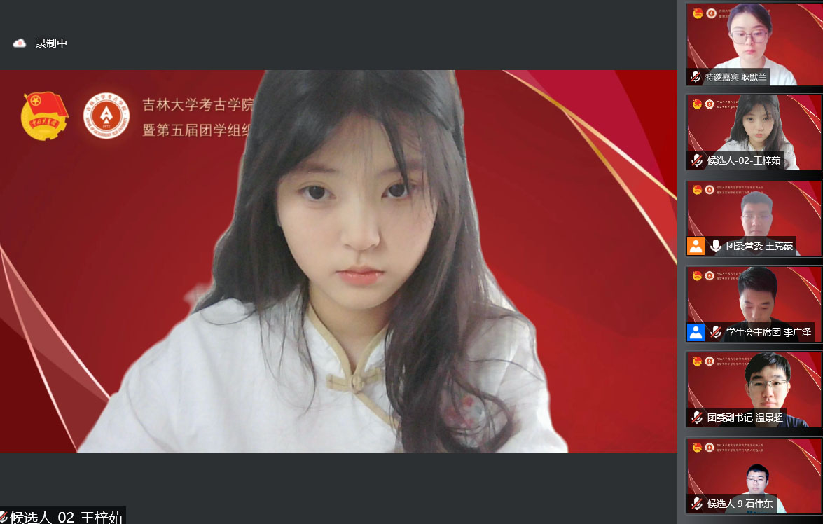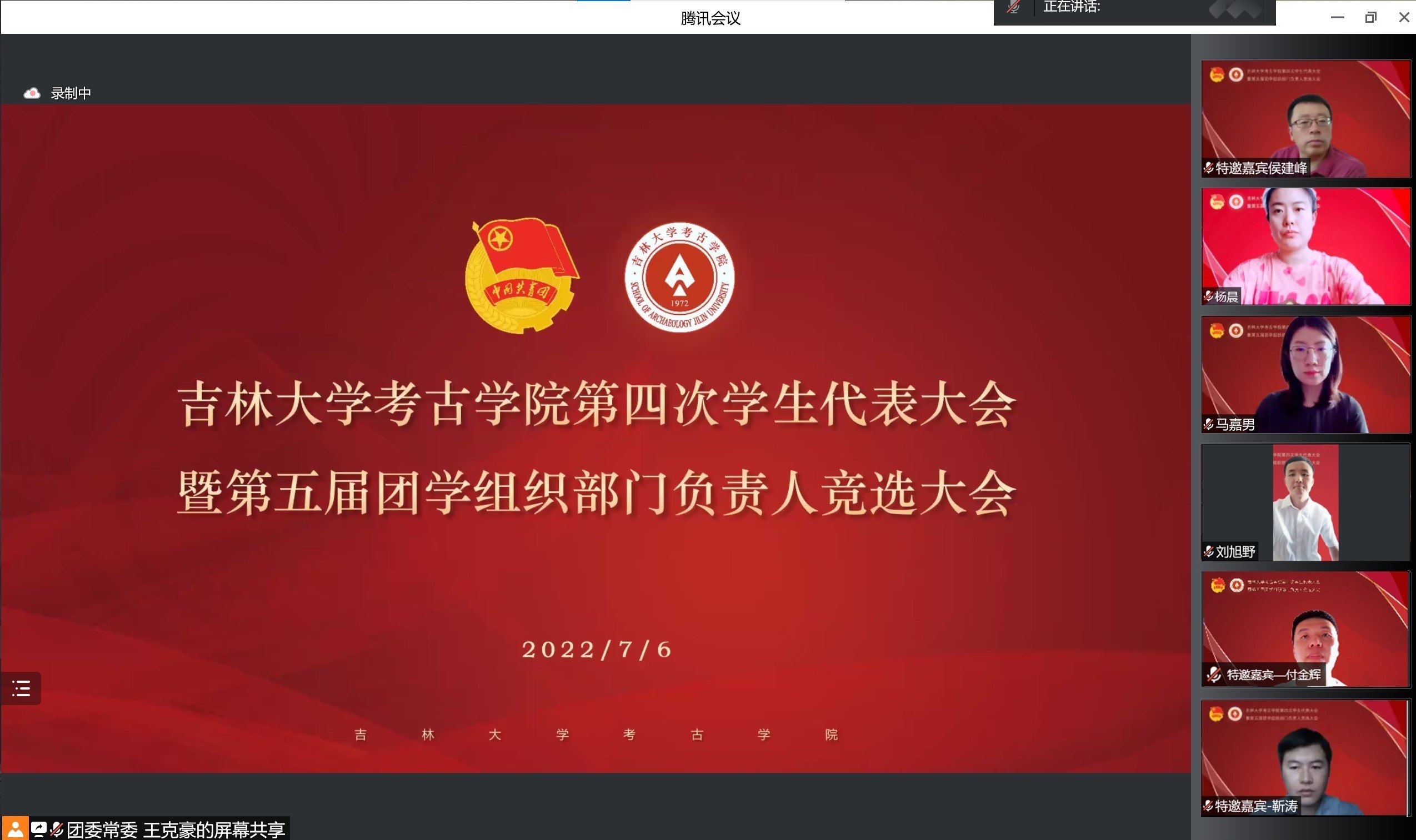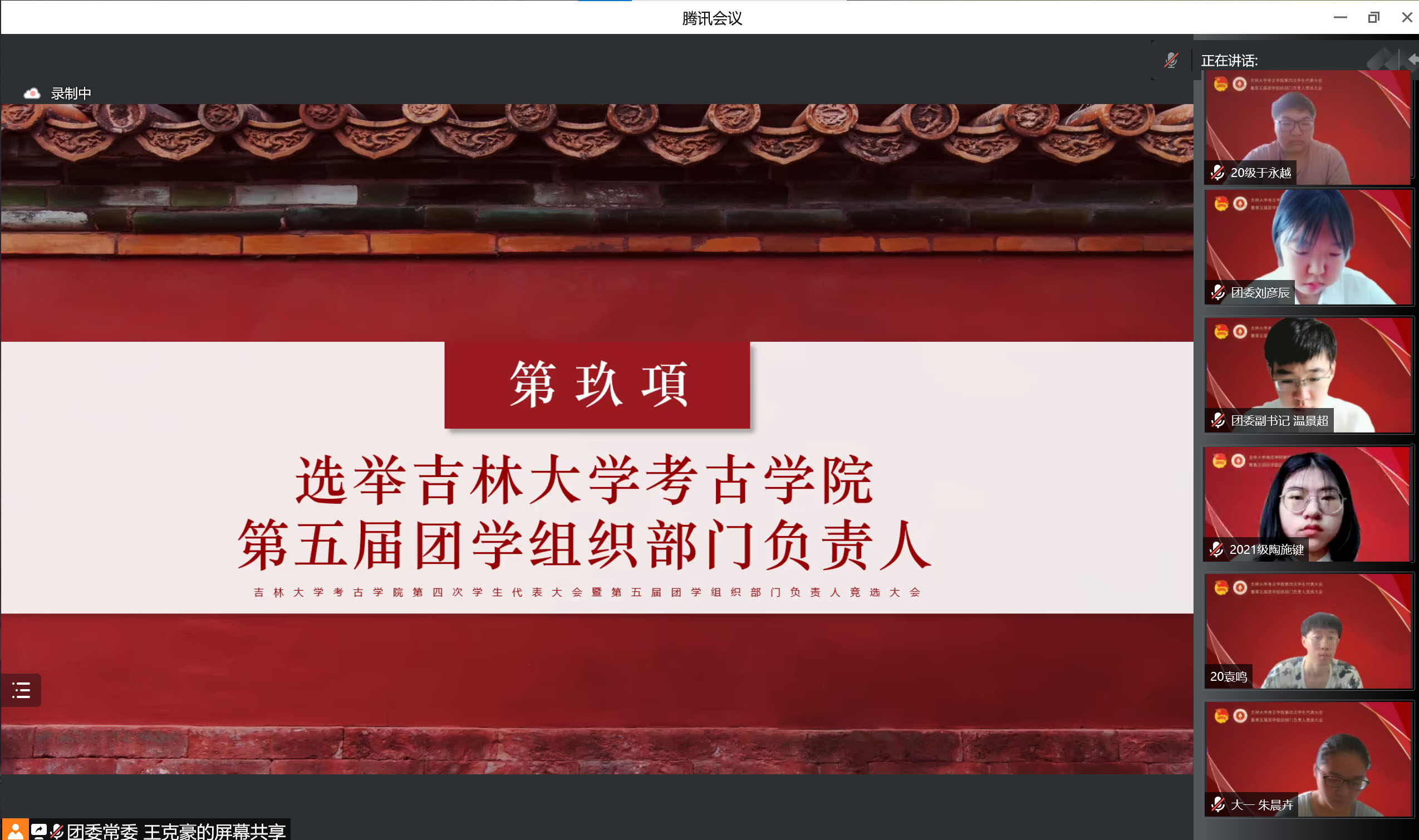 大會第一項,全體起立,奏唱國歌,本次會議在莊嚴的國歌聲中拉開序幕。大會第二項,籌備委員會代表李廣澤宣讀籌備工作報告。大會第三項,院團委副書記溫景超做主題為“眾行致遠 行則將至”的第四屆團委工作匯報。大會第四項,院學生會執(zhí)行主席李廣澤做主題為“賡續(xù)理想 踐行初心”的第四屆學生會工作匯報。大會第五項,院學生代表大會提案組組長張靈江做提案工作匯報。大會第六項,團委負責人馬嘉男老師宣讀團學組織負責人選舉規(guī)則。大會第七項,主持人宣讀總監(jiān)票員、監(jiān)票員、計票員以及團學組織部門負責人候選人名單,并表決通過各項名單。大會第八項,太陽成集團tyc151cc第四屆團學組織部門負責人選舉環(huán)節(jié)正式開始,各位候選人分別進行演講闡述。大會第九項,與會師生結合各位競選者綜合情況,進行線上無記名投票。最后,在激昂的《吉林大學校歌》聲中,太陽成集團tyc151cc第四次學生代表大會暨第五屆團學組織部門負責人競選大會圓滿結束。