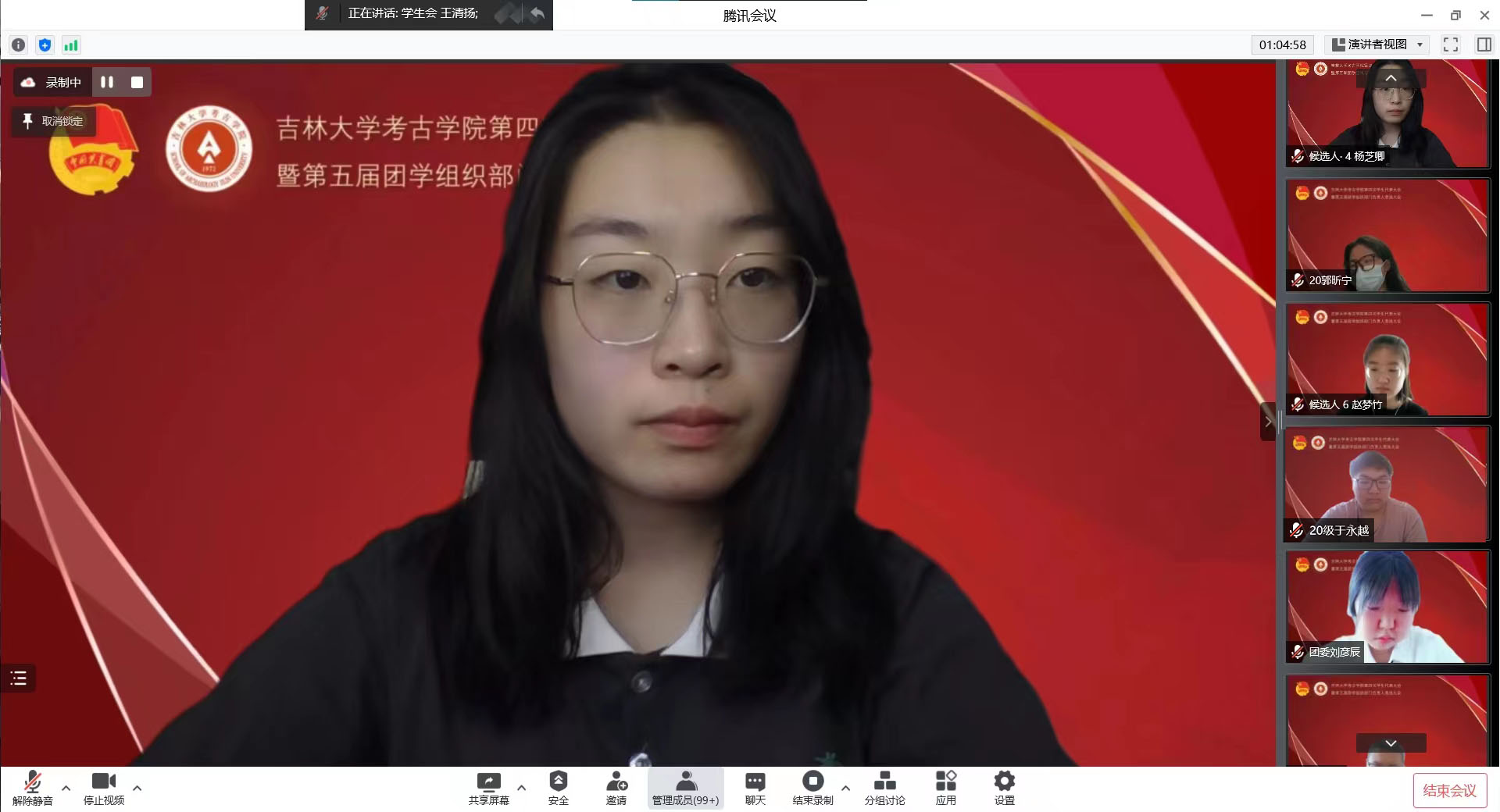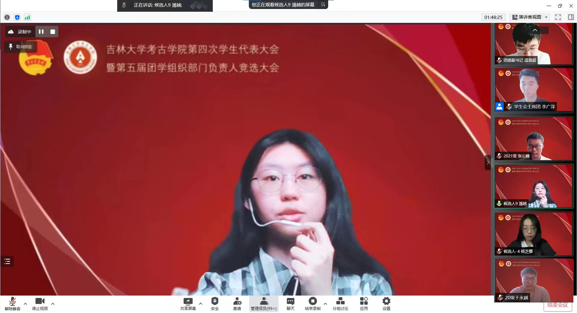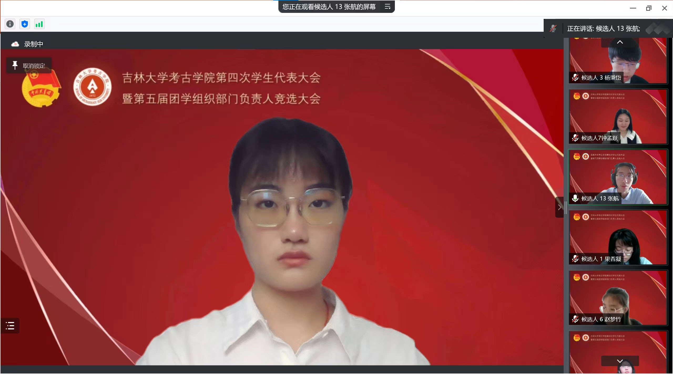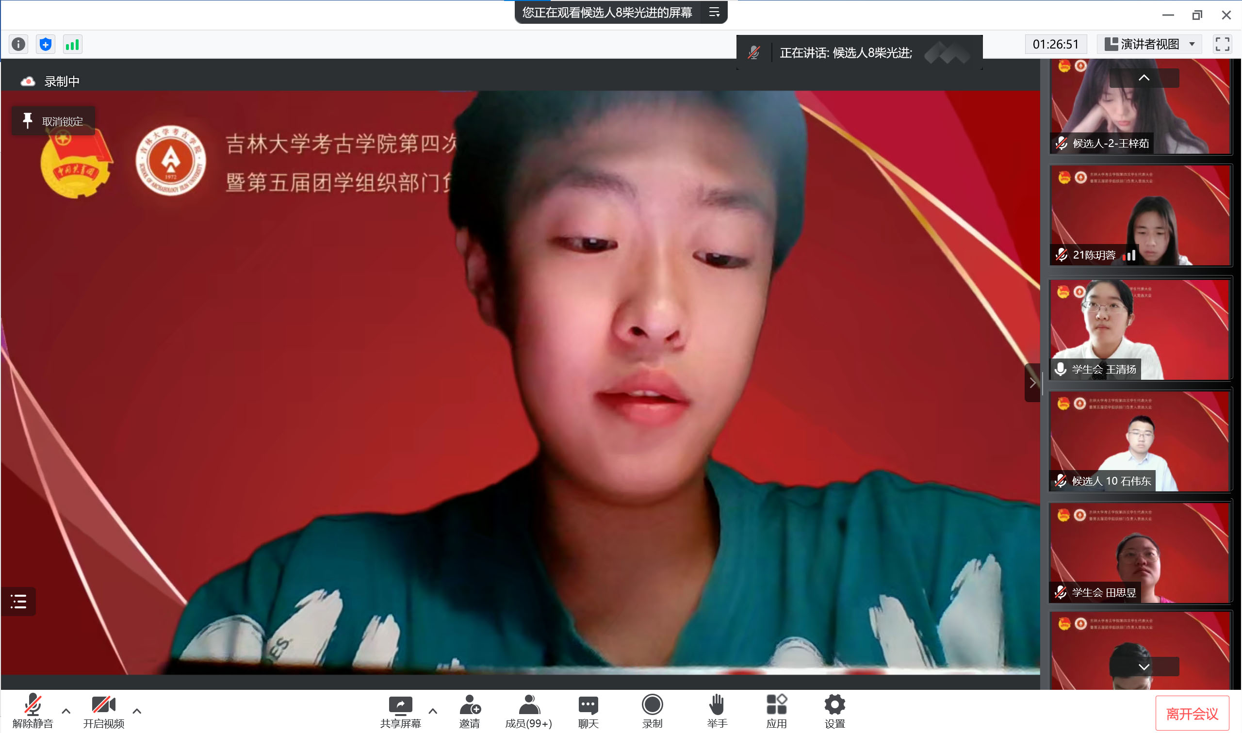 大會第一項,全體起立,奏唱國歌,本次會議在莊嚴的國歌聲中拉開序幕。大會第二項,籌備委員會代表李廣澤宣讀籌備工作報告。大會第三項,院團委副書記溫景超做主題為“眾行致遠 行則將至”的第四屆團委工作匯報。大會第四項,院學生會執(zhí)行主席李廣澤做主題為“賡續(xù)理想 踐行初心”的第四屆學生會工作匯報。大會第五項,院學生代表大會提案組組長張靈江做提案工作匯報。大會第六項,團委負責人馬嘉男老師宣讀團學組織負責人選舉規(guī)則。大會第七項,主持人宣讀總監(jiān)票員、監(jiān)票員、計票員以及團學組織部門負責人候選人名單,并表決通過各項名單。大會第八項,太陽成集團tyc151cc第四屆團學組織部門負責人選舉環(huán)節(jié)正式開始,各位候選人分別進行演講闡述。大會第九項,與會師生結合各位競選者綜合情況,進行線上無記名投票。最后,在激昂的《吉林大學校歌》聲中,太陽成集團tyc151cc第四次學生代表大會暨第五屆團學組織部門負責人競選大會圓滿結束。