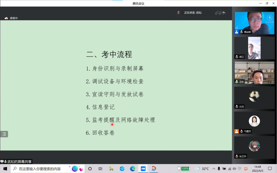會(huì)議伊始,楊晨老師圍繞此次期末考試的考前誠(chéng)信教育,傳達(dá)了學(xué)校新下發(fā)的《線上考試要求及守則》的內(nèi)容與精神,對(duì)考試紀(jì)律作了強(qiáng)調(diào),要求同學(xué)們端正態(tài)度、恪守誠(chéng)信,遵守線上考場(chǎng)紀(jì)律,嚴(yán)守考試規(guī)則,服從監(jiān)考老師管理,自覺(jué)抵制考試作弊的不良風(fēng)氣。同時(shí),針對(duì)在國(guó)家高考期間,防止替考、代考等行為出現(xiàn),楊老師向同學(xué)們宣講了刑法和《普通高等學(xué)校學(xué)生管理規(guī)定》中的相關(guān)內(nèi)容,講解了考試違紀(jì)、考試作弊的條款和后果,告誡同學(xué)們要堅(jiān)決杜絕參與作弊和擾亂考試秩序等不良行為。隨后,武松老師從考前準(zhǔn)備、考中流程和考后歸檔工作三個(gè)環(huán)節(jié),對(duì)同學(xué)們進(jìn)行了線上考核操作流程的基本培訓(xùn)。在培訓(xùn)過(guò)程中,武松老師著重講解了同學(xué)們關(guān)心的考試所需設(shè)備及考場(chǎng)環(huán)境等具體要求,并介紹了相關(guān)注意事項(xiàng)。之后,太陽(yáng)成集團(tuán)tyc151cc副院長(zhǎng)段天璟老師作了總結(jié)發(fā)言。段老師指出,由于疫情突發(fā),今年春季學(xué)期師生們只能在“云”端見(jiàn)面交流,經(jīng)受住了很多挑戰(zhàn)和考驗(yàn)。臨近期末,學(xué)院對(duì)考務(wù)工作進(jìn)行了詳細(xì)策劃和部署,同學(xué)們也要盡量克服線上考試的諸多不確定因素,保持積極的學(xué)習(xí)勁頭,傳承吉大考古“嚴(yán)謹(jǐn)認(rèn)真、艱苦奮斗、實(shí)事求是、活躍思想”的良好學(xué)風(fēng),相信這個(gè)學(xué)期獨(dú)特的學(xué)習(xí)和考核過(guò)程將成為同學(xué)們求學(xué)過(guò)程中的一筆寶貴財(cái)富,同時(shí)祝福大家都取得滿意的成績(jī)。會(huì)議最后,段天璟老師和武松老師針對(duì)同學(xué)們提出的考試設(shè)備等技術(shù)問(wèn)題做出了回答。侯建峰老師最后強(qiáng)調(diào),同學(xué)們要嚴(yán)格遵守考試紀(jì)律,如果在演練過(guò)程中發(fā)現(xiàn)問(wèn)題,要及時(shí)與監(jiān)考老師溝通以盡早解決問(wèn)題。