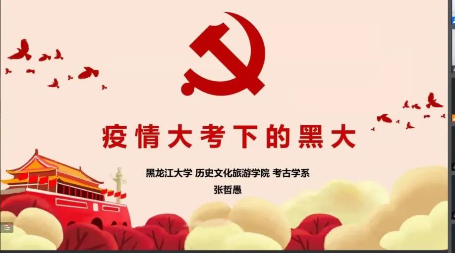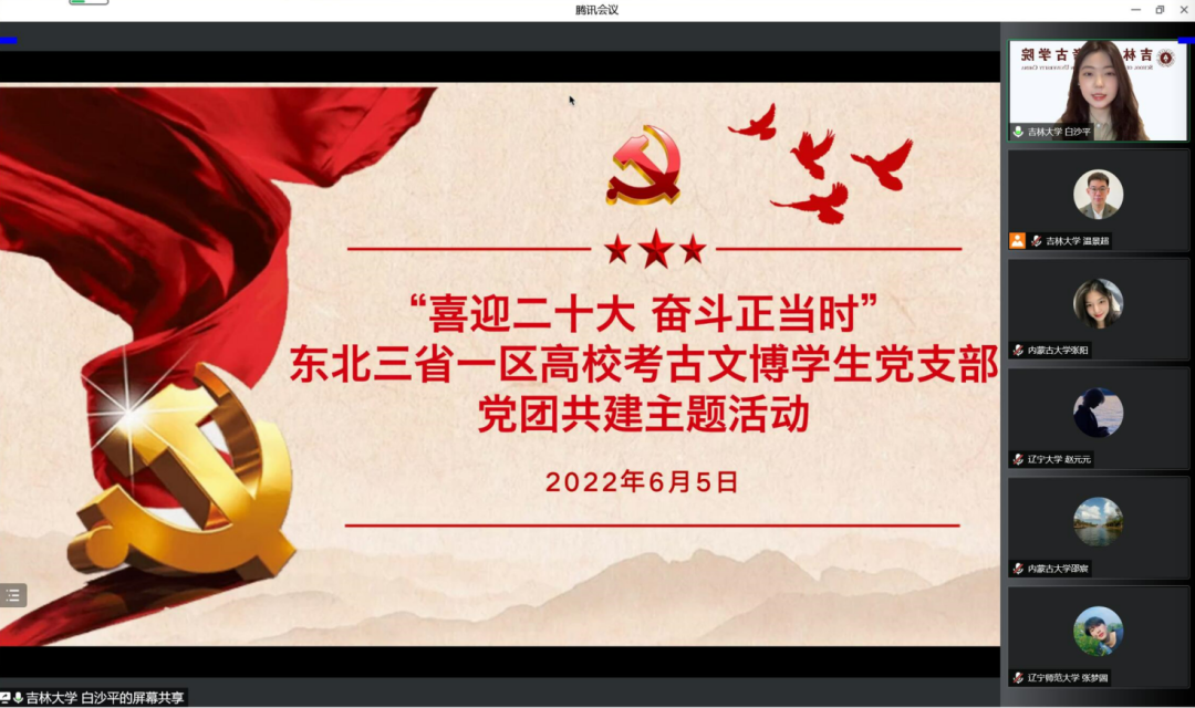 2022年是中國共產(chǎn)黨第二十次全國代表大會(huì)召開之年,是中國共產(chǎn)主義青年團(tuán)成立一百周年,也是吉林大學(xué)考古學(xué)科創(chuàng)建五十周年。為迎接和學(xué)習(xí)宣傳黨的二十大,激勵(lì)廣大青年學(xué)子堅(jiān)定理想信念、統(tǒng)一意志、共同奮斗,落實(shí)高校立德樹人根本任務(wù)。6月5日,太陽成集團(tuán)tyc151cc本科生黨支部聯(lián)合東北師范大學(xué)、黑龍江大學(xué)、遼寧大學(xué)、遼寧師范大學(xué)、內(nèi)蒙古大學(xué)、內(nèi)蒙古師范大學(xué)、赤峰學(xué)院,共8所東北三省一區(qū)的高??脊盼牟W(xué)科黨團(tuán)支部共同開展了“喜迎二十大 奮斗正當(dāng)時(shí)”主題黨團(tuán)共建活動(dòng)?;顒?dòng)以線上方式開展,來自東北地區(qū)高??脊盼牟﹩挝坏娜辔粚W(xué)院領(lǐng)導(dǎo)、教師和二百余名學(xué)生代表相聚云端,共同交流了高??脊盼牟W(xué)科協(xié)同發(fā)展、高校黨建與學(xué)生思想教育融合發(fā)展、新時(shí)代考古青年的責(zé)任擔(dān)當(dāng)?shù)茸h題。