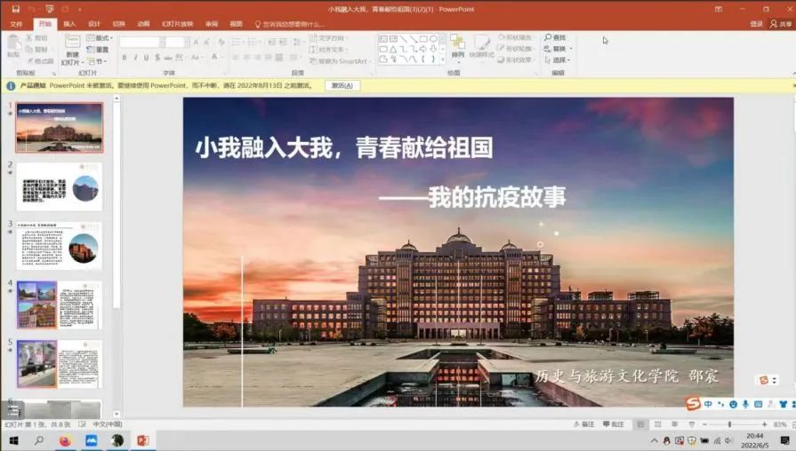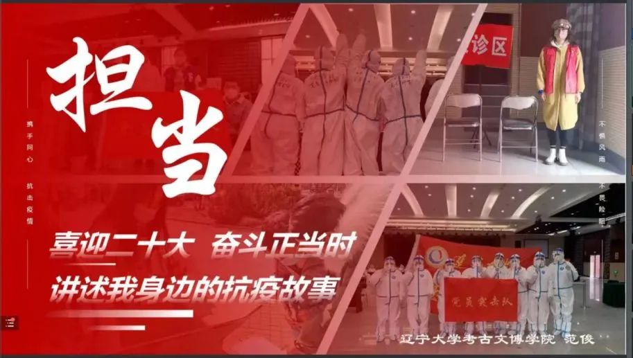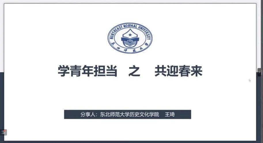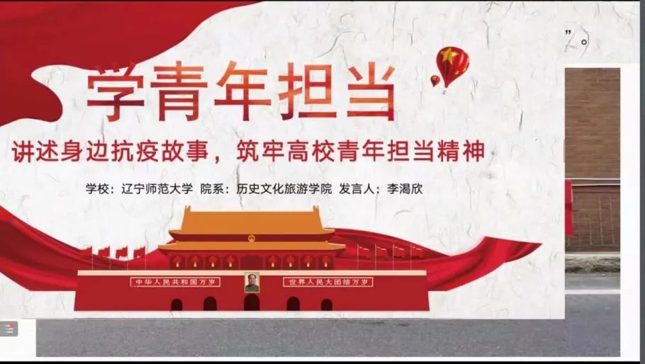 自2020年新冠肺炎疫情暴發(fā)以來,全國各地陸續(xù)出現(xiàn)了多起疫情風(fēng)波。高校青年學(xué)子在參加防疫抗疫的過程中譜寫了一個(gè)個(gè)先進(jìn)典型事跡,展現(xiàn)了新時(shí)代青年學(xué)子的擔(dān)當(dāng)精神。活動(dòng)的第二環(huán)節(jié),由各高校學(xué)生代表講述身邊的抗疫故事。來自赤峰學(xué)院歷史文化學(xué)院的李昊澤、東北師范大學(xué)歷史文化學(xué)院的王琦、黑龍江大學(xué)歷史文化旅游學(xué)院的張哲愚、遼寧大學(xué)考古文博學(xué)院的范俊、遼寧師范大學(xué)歷史文化旅游學(xué)院的李渴欣、內(nèi)蒙古大學(xué)歷史與旅游文化學(xué)院的邵宸、內(nèi)蒙古師范大學(xué)歷史文化學(xué)院的鄭雅雯共七位學(xué)生代表,分別從學(xué)院黨團(tuán)支部如何發(fā)揮戰(zhàn)斗堡壘作用,青年黨員如何在疫情防控中如何發(fā)揮模范帶頭作用等多個(gè)角度,分享了自己學(xué)校在屬地疫情防控期間的抗疫故事和經(jīng)驗(yàn),詮釋了青年學(xué)子以實(shí)際行動(dòng)踐行青春使命的光輝事跡。