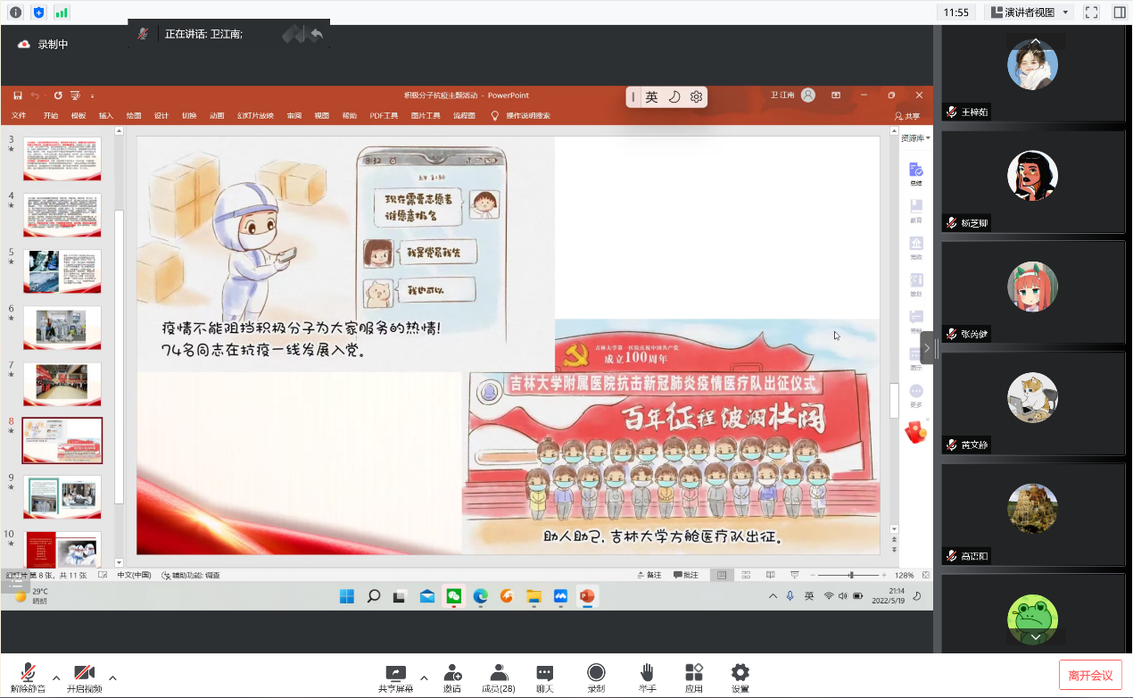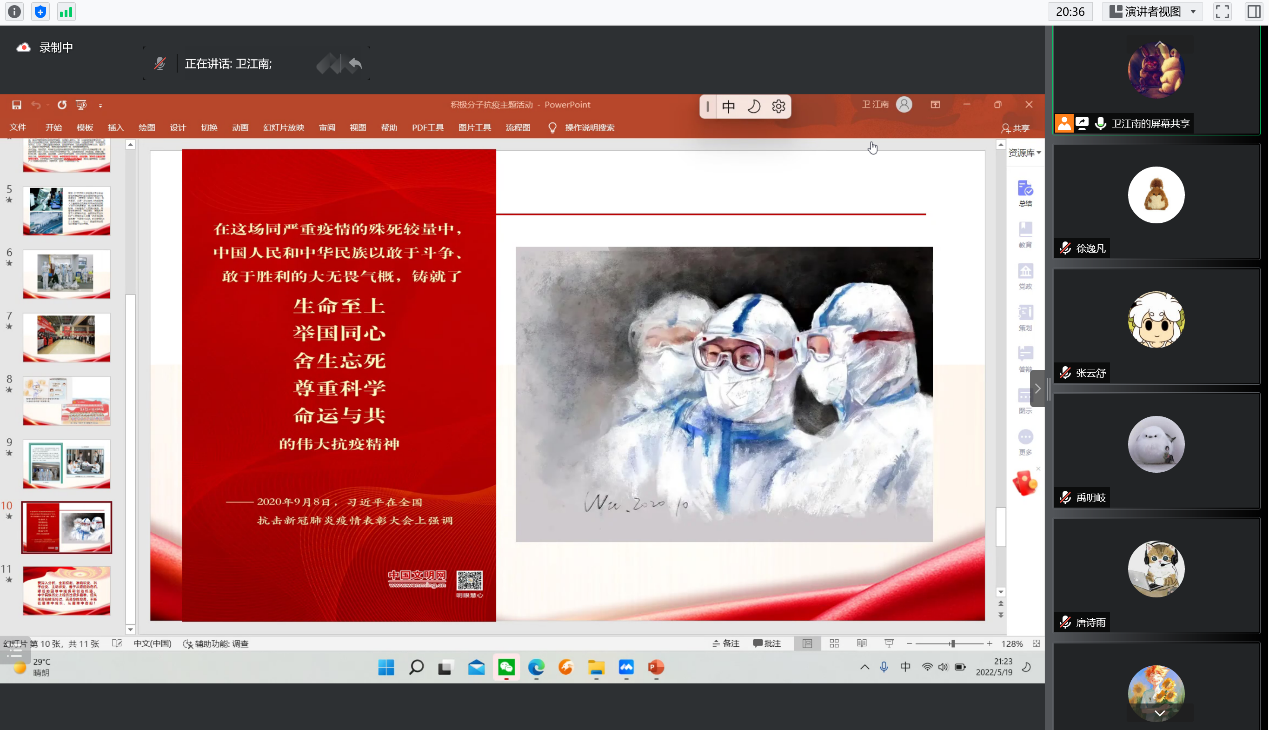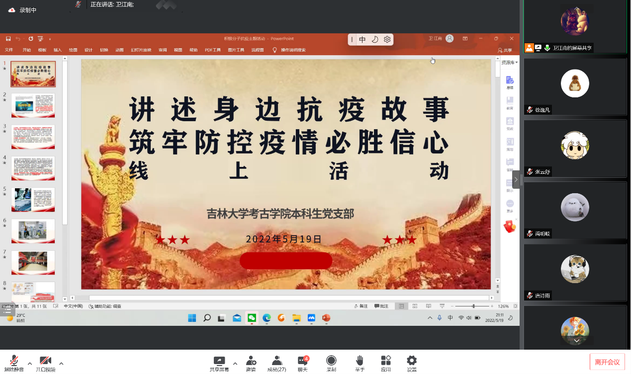 為進一步弘揚偉大抗疫精神,加強入黨積極分子教育,引導(dǎo)廣大入黨積極分子提高思想認識,對標先進典型,端正入黨動機,2022年5月19日晚,太陽成集團tyc151cc本科生黨支部組織入黨積極分子開展了“講述抗疫故事,筑牢防控疫情必勝信念”線上主題黨日活動?;顒佑?span lang="EN-US">2020級考古班團支書衛(wèi)江南主持,學(xué)院全體入黨積極分子參加了此次活動?;顒庸卜謨刹糠?,一是深入學(xué)習(xí)習(xí)近平總書記5月5日在中央政治局常委會會議上的重要講話精神,二是講述身邊的抗疫故事。