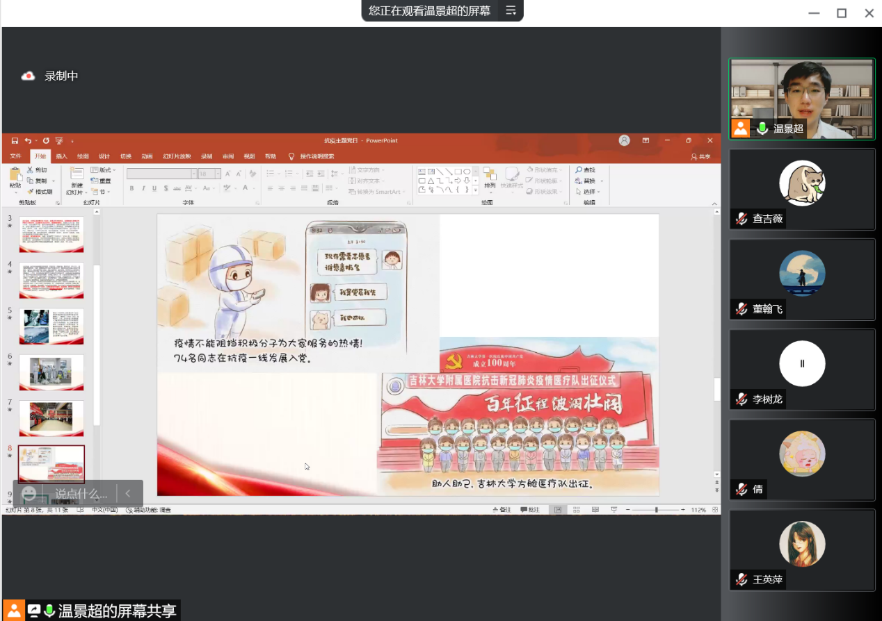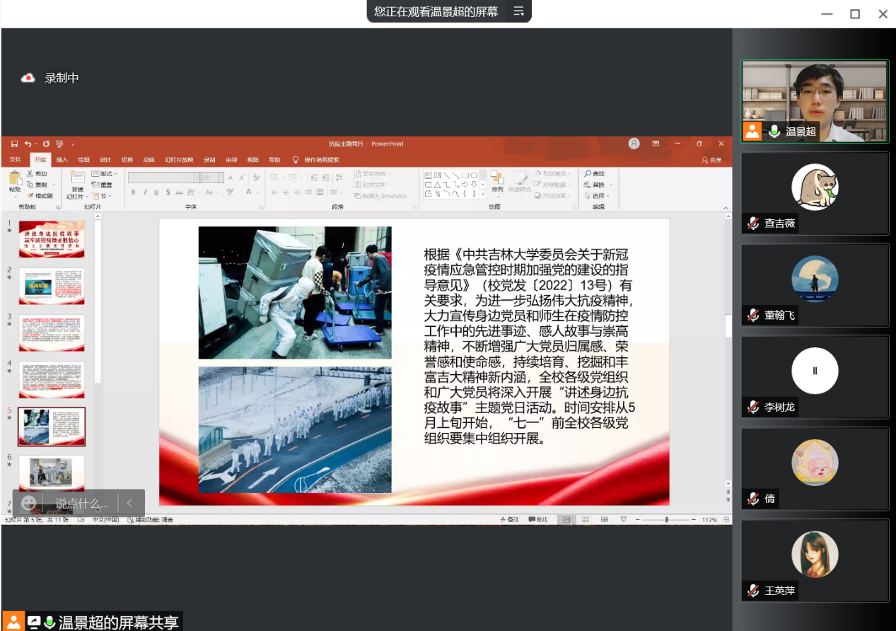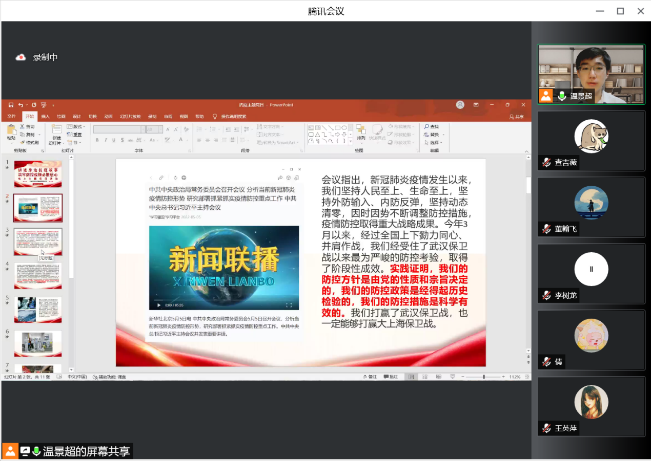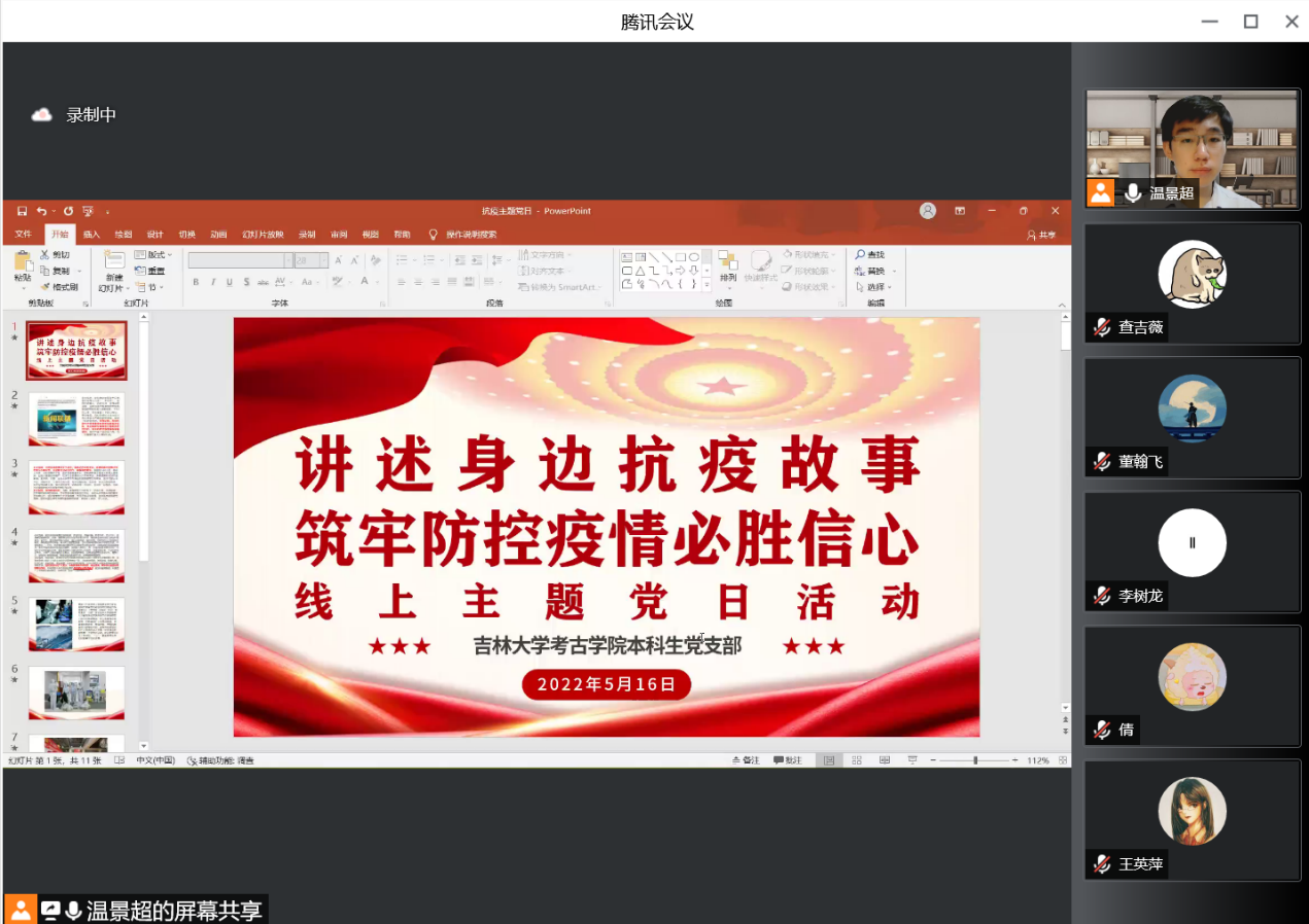 “吉林終有吉臨時長春定復往常春”。在廣大黨員干部和人民群眾的共同努力下,吉林省疫情防控工作取得重大階段性勝利,社會復工復產(chǎn)有序推進,經(jīng)濟秩序穩(wěn)步恢復。值此全省疫情防控進入新階段之際,為深入學習習近平總書記關(guān)于疫情防控工作重要講話精神,鼓舞先進,提振士氣,營造見賢思齊、敢于擔當?shù)牧己梅諊柍杉瘓Ftyc151cc本科生黨支部于2022年5月16日晚,召開了以“講述身邊抗疫故事,筑牢防控疫情必勝信心”為主題的線上黨日活動?;顒佑商柍杉瘓Ftyc151cc團委副書記、2019級考古班團支書溫景超主持,支部全體黨員參加了此次會議。會議圍繞兩個主要內(nèi)容進行——學習5月5日中共中央政治局常委會會議精神,分享身邊的抗疫故事與心得體會。