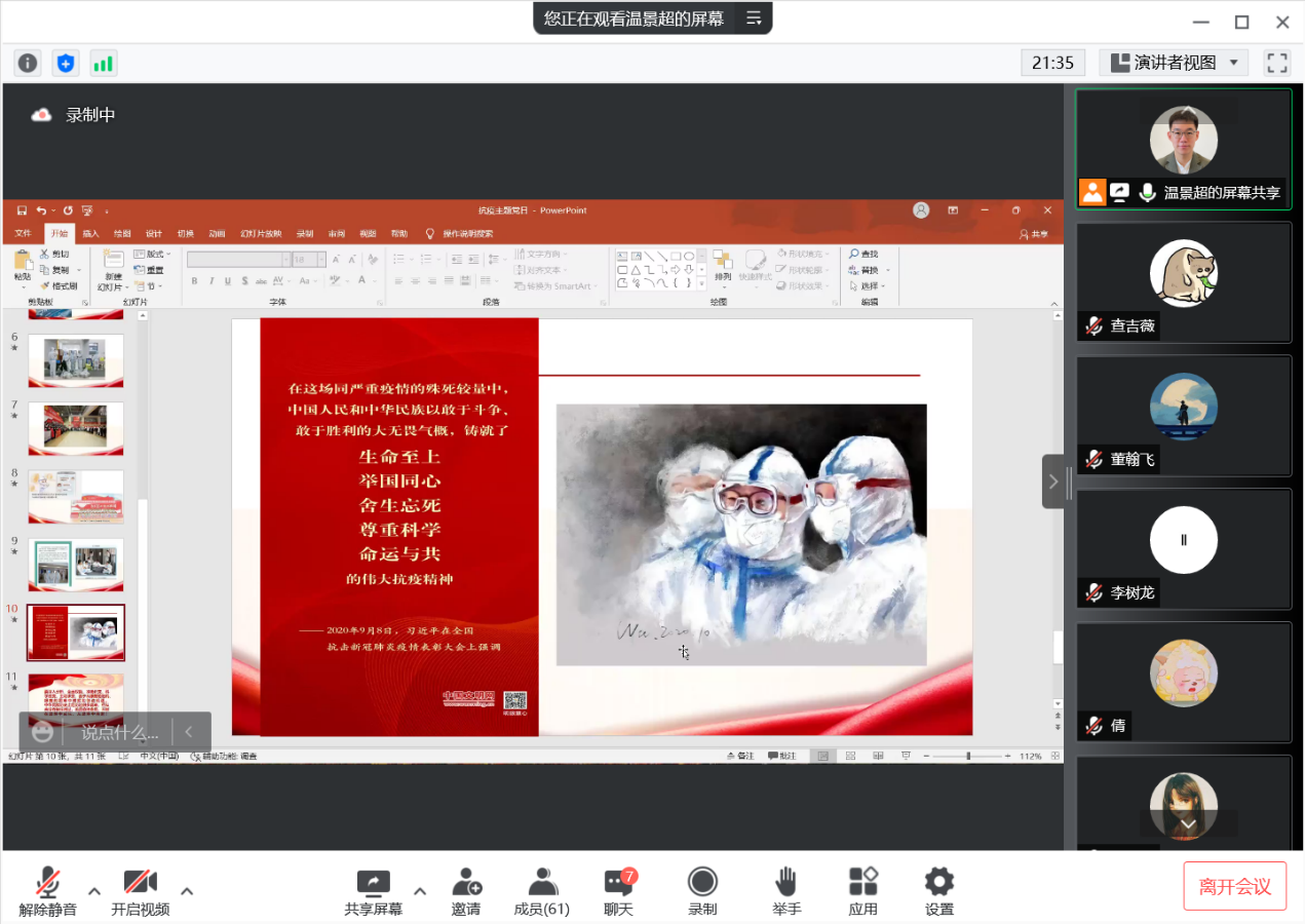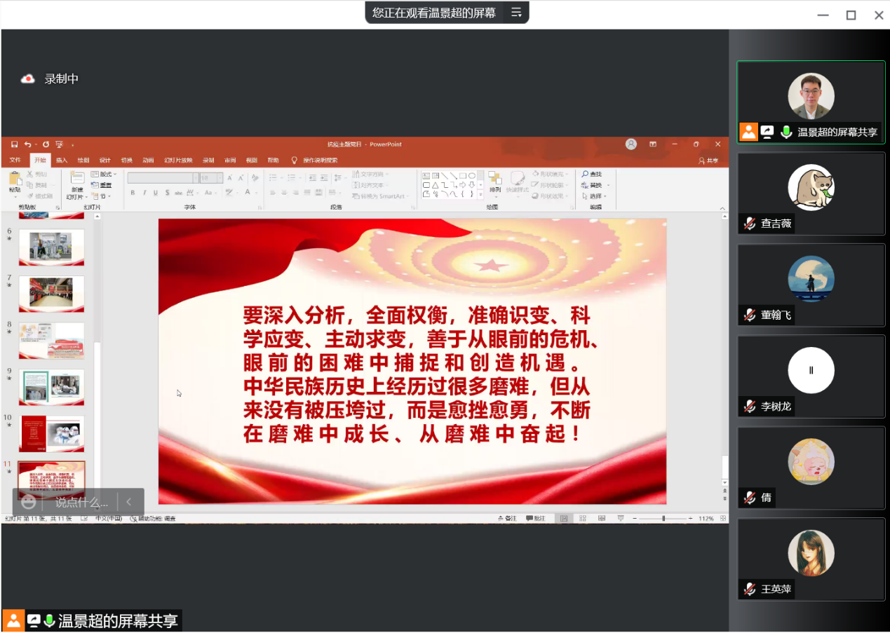 最后,主持人號召全體黨員和預備黨員同志要時刻牢記自己的黨員身份,堅定立場,和黨中央時刻保持一致,用自身的行動和實踐去駁斥消極抗疫的錯誤觀點,始終堅持生命至上、舉國同心、舍生忘死、尊重科學、命運與共的偉大抗疫精神。他引用習近平總書記的兩段話送給與會同學——“要深入分析,全面權(quán)衡,準確識變,科學應變,主動求變,善于從眼前的危機,眼前的困難中捕捉和創(chuàng)造機遇”、“中華民族歷史上經(jīng)歷過很多磨難,但從來沒有被壓垮過,而是愈挫愈勇,不斷在磨難中成長,從磨難中奮起”。