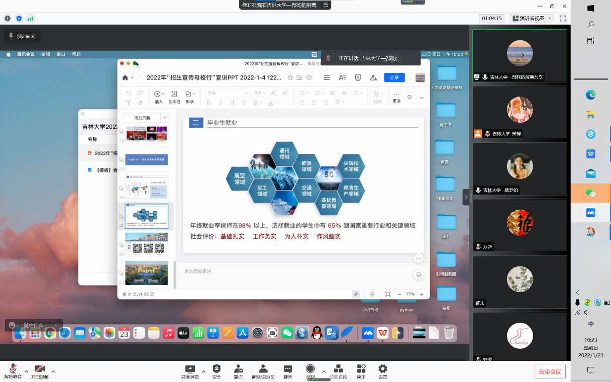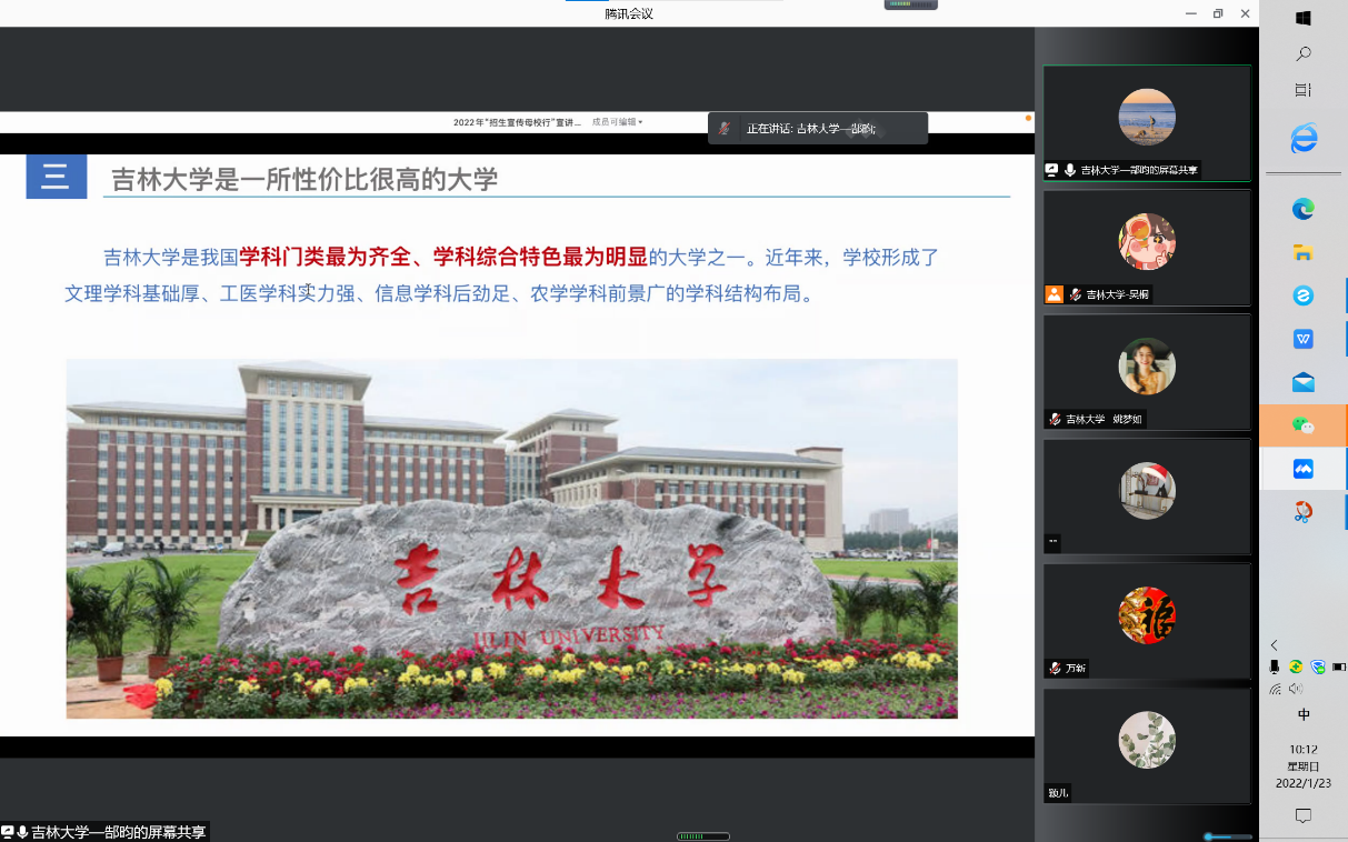 由于疫情的原因,宣講活動(dòng)選擇了以線上會(huì)議的方式進(jìn)行。宣講活動(dòng)正式開始之前,吳桐與所在高中學(xué)校的老師進(jìn)行了溝通銜接,在高三家長(zhǎng)群里發(fā)布了線上宣講的通知。此外,吳桐同學(xué)與組內(nèi)其他同學(xué)一同制作了吉林大學(xué)宣傳小視頻,以圖片的方式向大家直觀地展示了吉林大學(xué)的校內(nèi)環(huán)境和教學(xué)氛圍。在宣講活動(dòng)進(jìn)行過程中,團(tuán)隊(duì)根據(jù)學(xué)校統(tǒng)一發(fā)放的吉林大學(xué)招生宣傳視頻和PPT,積極向參加這次招生宣傳活動(dòng)的學(xué)弟學(xué)妹和家長(zhǎng)們宣傳吉林大學(xué)。宣講活動(dòng)從五個(gè)方面對(duì)吉林大學(xué)進(jìn)行了全面的介紹:學(xué)校概況、杰出校友、校園環(huán)境、未來展望、在皖招生情況。每一個(gè)方面都進(jìn)行了較為詳盡的介紹。為了吸引學(xué)弟學(xué)妹們,團(tuán)隊(duì)成員以自身經(jīng)歷為例,談了一些自己在吉大學(xué)習(xí)生活這半年來的感觸和收獲,分享了自己在吉大的見聞和故事,內(nèi)容涉及美麗的校園環(huán)境,豐富多彩的校園生活,濃厚的學(xué)術(shù)氛圍和高素質(zhì)的教師團(tuán)隊(duì)等多個(gè)方面。除此之外,作為吉林大學(xué)強(qiáng)基計(jì)劃錄取的學(xué)生,吳桐同學(xué)也向?qū)W弟學(xué)妹們宣傳了吉林大學(xué)的強(qiáng)基計(jì)劃以及相關(guān)政策,為有意愿選擇吉林大學(xué)強(qiáng)基計(jì)劃的學(xué)弟學(xué)妹們答疑解惑。