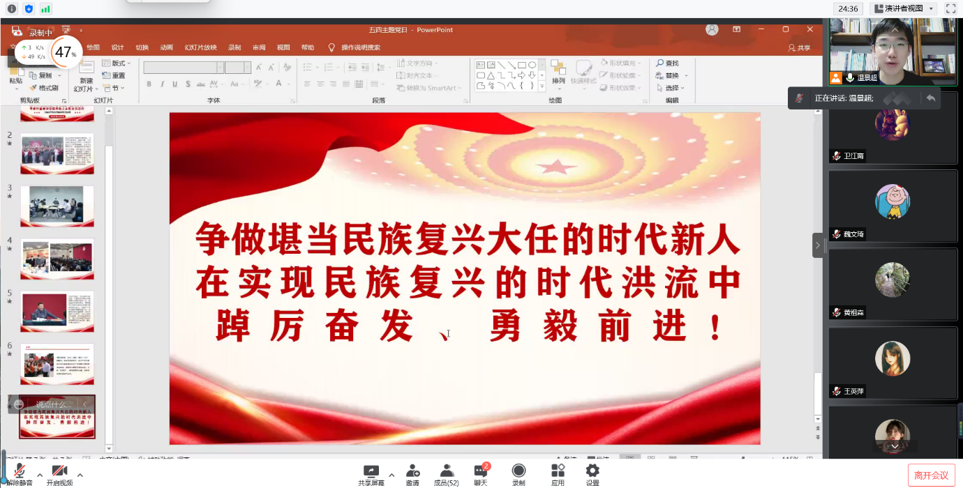 最后,溫景超總結(jié)道,各位同學(xué)雖然已經(jīng)是黨員或預(yù)備黨員的身份,但絕大多數(shù)同學(xué)也保留著團(tuán)員的身份,因此我們的身份是比較特殊的,我們身上的擔(dān)子和意義也是特殊的。我們既要貫徹和發(fā)揚(yáng)黨的指示,也要學(xué)習(xí)和踐行團(tuán)給我們的指示。我們承擔(dān)著點(diǎn)亮一盞燈,照亮一大片的職責(zé),各位黨員同學(xué)要努力帶動(dòng)身邊的同學(xué)一起為中華民族偉大復(fù)興添磚加瓦,這個(gè)身份是賦予我們的光榮使命,我們要不斷提升理論素養(yǎng),當(dāng)好宣傳員,把黨的理念正確及時(shí)傳達(dá)到身邊同學(xué)的心中。