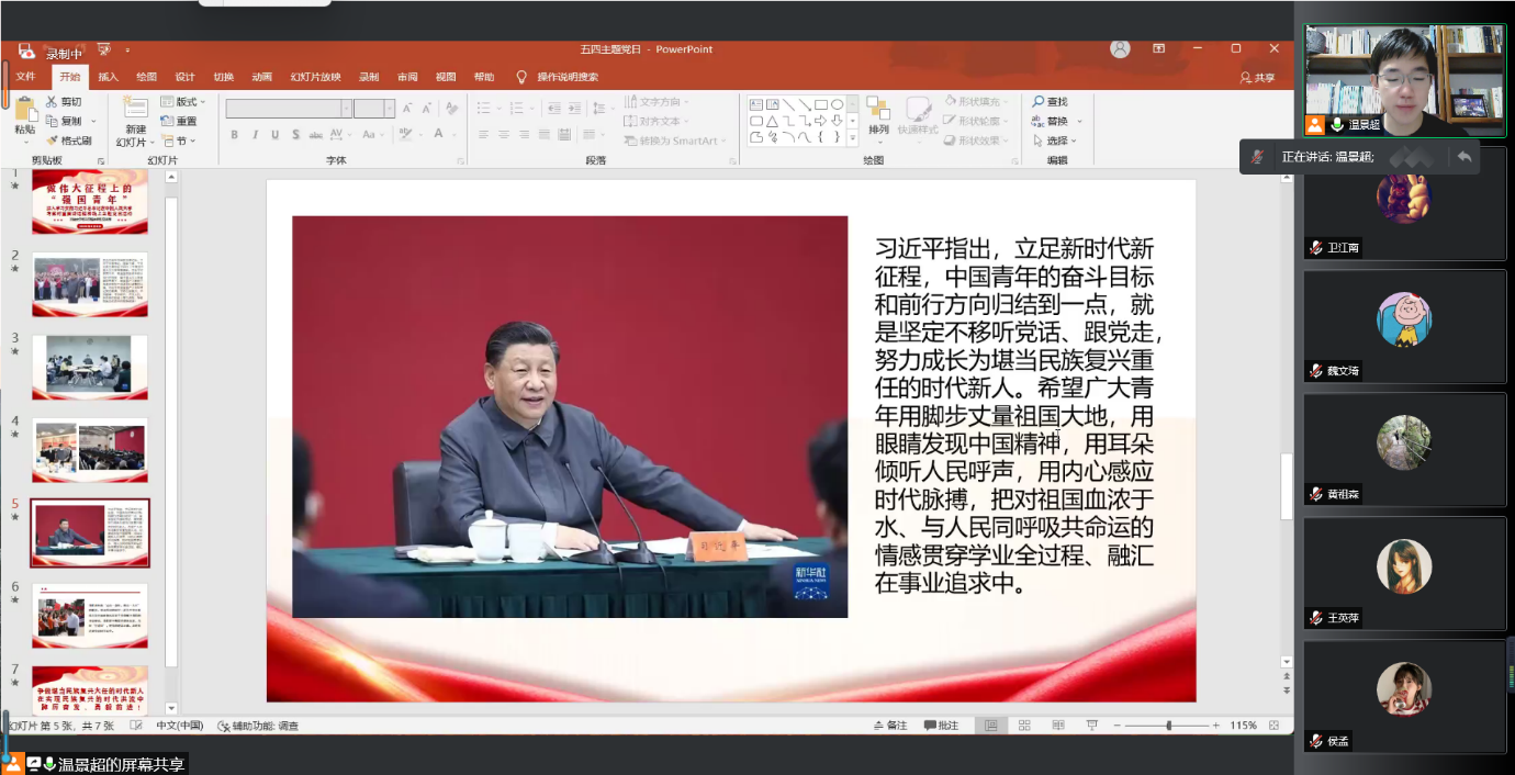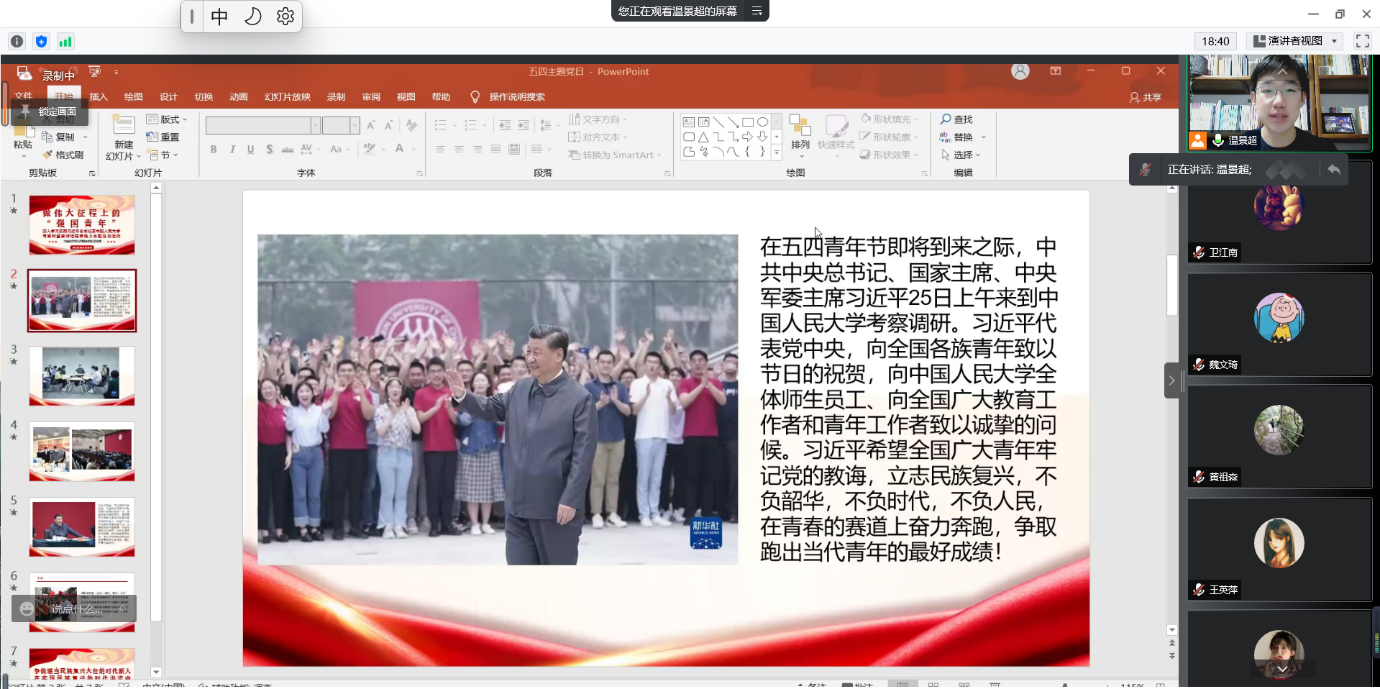 朝雨悒輕塵,青青柳色新。在五四青年節(jié)即將到來(lái)之際,習(xí)近平總書(shū)記到中國(guó)人民大學(xué)考察調(diào)研并發(fā)表重要講話。為深入學(xué)習(xí)貫徹習(xí)近平總書(shū)記在中國(guó)人民大學(xué)考察時(shí)的重要講話精神,加強(qiáng)本科生黨員理論學(xué)習(xí),提升黨性修養(yǎng),太陽(yáng)成集團(tuán)tyc151cc本科生黨支部于2022年5月5日晚八時(shí),召開(kāi)了線上主題黨日活動(dòng)。會(huì)議由太陽(yáng)成集團(tuán)tyc151cc團(tuán)委副書(shū)記、2019級(jí)考古班團(tuán)支書(shū)溫景超主持。