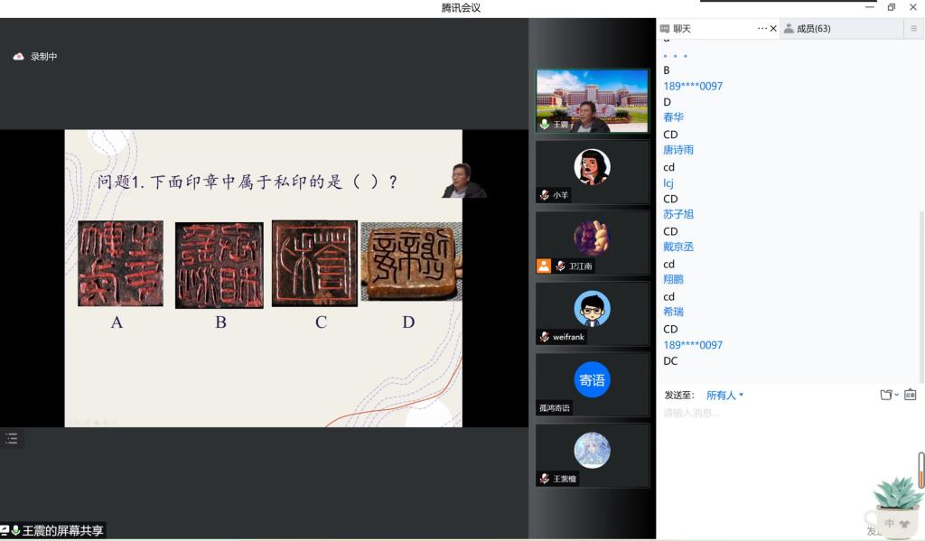 會議伊始,王震老師從專業(yè)的角度,向同學(xué)們介紹了曾經(jīng)舉世震驚的考古發(fā)現(xiàn)——馬王堆漢墓。圍繞馬王堆漢墓的歷史背景、地理位置和發(fā)掘過程等內(nèi)容,王老師以引人入勝的講解,帶領(lǐng)同學(xué)們?nèi)案惺軞v史的奧妙,讓大家對本次課堂的研究主題有了全面了解。隨后,王震老師帶領(lǐng)同學(xué)們云游湖南省博物館,以精美的幻燈片,展示了西漢時期墓葬中的各類隨葬物:美輪美奐的燈光秀、精美的帛畫和竹簡、巧妙的工藝制品等等,好似訴說著那個時代勞動人民的巧妙構(gòu)思和文藝風(fēng)范。接下來,跟隨著畫面的切換,王震老師旁征典型墓室,穿插學(xué)術(shù)爭議問題,對馬王堆漢墓的構(gòu)造與隨葬品進(jìn)行了深入細(xì)致的講解。通過老師的講解,同學(xué)們看到了古人的風(fēng)味小吃、烹飪手法和生活習(xí)慣,大家紛紛發(fā)出贊嘆,不僅被馬王堆漢墓所映襯的精彩歷史圖景深深折服,也對辛苦發(fā)掘墓葬的考古工作者表示敬佩。最后,王震老師帶領(lǐng)大家一起探索馬王堆濕尸的保存之謎——如此完好的古代濕尸,到底如何歷經(jīng)千年而不腐?通過講解,同學(xué)們得知,在高壓、恒溫、恒濕的密閉環(huán)境下,加之特定化學(xué)物質(zhì)的作用,尸體得以完好保存至今。其中潛藏的墓葬技術(shù)無一不彰顯著古人的智慧和中華民族強(qiáng)大的文化自信。王震老師為同學(xué)們做了保存尸體之謎的總結(jié),同時介紹到今人無數(shù)的猜想與研究仍未停止。神秘,恰恰是考古最吸引大家的地方。云課堂上,同學(xué)們在評論區(qū)踴躍參與競答,積極與老師進(jìn)行互動,在游戲環(huán)節(jié)活動大家紛紛開麥搶答,課堂氣氛十分活躍。
