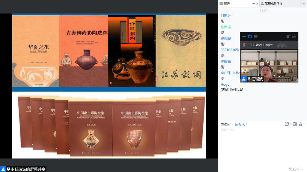 會(huì)議開始,任老師以數(shù)張親身游歷的彩陶實(shí)景引領(lǐng)大家進(jìn)入彩陶的世界,并向大家推薦了一系列介紹彩陶的著作,以點(diǎn)窺面,巧妙地將彩陶融于宏觀的藝術(shù)史中進(jìn)行講述,引出了本次會(huì)議的主題——彩陶紋飾。任老師按照從一般到具體的講述邏輯,將第一部分象形的彩陶?qǐng)D案娓娓道來(lái)。本部分共分為地上走獸、天上飛鳥、水中游魚等六大板塊。其間,任老師將典型器物的具象紋飾與現(xiàn)實(shí)存在一一對(duì)比,并結(jié)合最新研究情況進(jìn)行拓展補(bǔ)充,令人深感小小彩陶與社會(huì)習(xí)俗連接之密切。在第二部分,任老師用組合拆分和抽象演繹的方式對(duì)彩陶的特殊圖案進(jìn)行了解讀,介紹了先人所創(chuàng)造的圖騰、巫術(shù)、神靈等事物,解開了蒙在彩陶上的一層又一層神秘的面紗。講解漸漸臨近尾聲,任老師借用名家之言向大家說(shuō)道:無(wú)論是“為神綻放”還是“為禮歌唱”,彩陶無(wú)疑帶來(lái)了文明的先聲,掀起了不可忽視的藝術(shù)狂潮。而對(duì)于彩陶眾說(shuō)紛紜的解讀現(xiàn)狀,任老師表示,其“只有起點(diǎn),沒(méi)有終點(diǎn)”。在這方面,他向大家推薦了一部電影以深入了解彩陶文化,同時(shí)也希望能給封寢期間的大家?guī)?lái)樂(lè)趣。作為終篇的搶答環(huán)節(jié),無(wú)疑是學(xué)術(shù)課堂的氣氛最高點(diǎn),同學(xué)們積極與任老師進(jìn)行互動(dòng),揭示了一個(gè)又一個(gè)彩陶的“冷知識(shí)”。最后,在輕松活躍的氛圍中,本次歡樂(lè)“云”學(xué)術(shù)活動(dòng)落下帷幕。