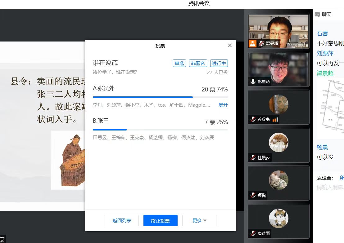 趙里萌老師從自己的學(xué)術(shù)論文《清明上河圖》地理位置新探中的研究論點(diǎn)出發(fā),穿越千年,與大家一起搜集線索、抽絲剝繭,尋找《清明上河圖》中的彩蛋,在北宋東京城里開展了一場(chǎng)燒腦的“推理探案”。活動(dòng)伊始,趙老師以幽默詼諧的語言和幻燈片營造出了歡快熱烈的課堂氛圍?;顒?dòng)正式開始后,同學(xué)們緊跟老師思路,抓住機(jī)會(huì)踴躍發(fā)言,積極與老師互動(dòng),并參與投票與答題。其間,趙老師不時(shí)穿插精彩講解,逐一為我們揭示了歷史名畫中隱藏的秘密?;顒?dòng)過程中,各環(huán)節(jié)的問答熱火朝天,學(xué)術(shù)氛圍濃厚,同學(xué)們興致勃勃,獲得了極強(qiáng)的參與感。