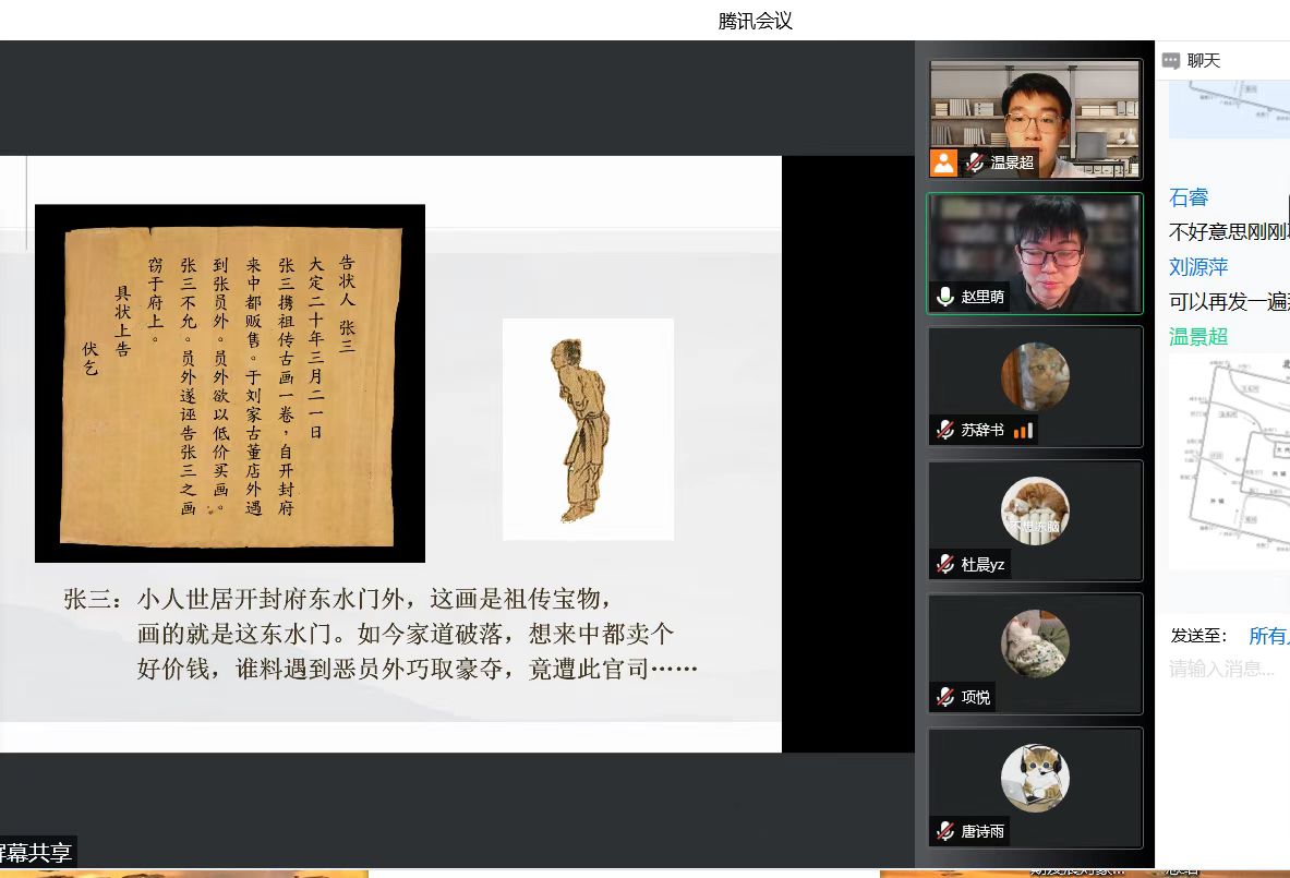 3月25日晚7時(shí),太陽成集團(tuán)tyc151cc舉辦了本系列的第一期活動(dòng),該期活動(dòng)的主題是“尋找《清明上河圖》中的彩蛋”。學(xué)術(shù)課堂由太陽成集團(tuán)tyc151cc本科生班主任趙里萌老師主講,2019級(jí)溫景超同學(xué)擔(dān)任活動(dòng)主持人。