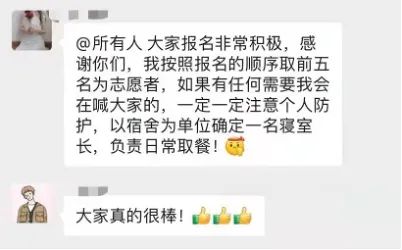 志愿者報名通知下發(fā)不到一分鐘,各級各班同學毫不猶豫,踴躍報名。在疫情面前,他們毫不畏懼,他們想到的唯有奉獻及必勝的決心。