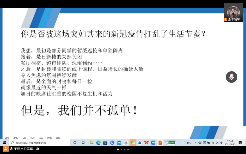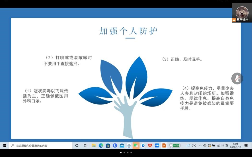 3月17日下午,太陽成集團tyc151cc2021級一班以“疫情下的我們”為切入點召開了主題班會。會議旨在展示學(xué)校人文關(guān)懷、宣傳線上活動,呼吁同學(xué)理性對待疫情。長春疫情發(fā)生以來,我班同學(xué)積極響應(yīng)學(xué)校號召,在全民抗疫的形勢下,不添亂不增負,嚴格遵循防疫需求,減少人員接觸,做好個人防護。在線上課程學(xué)習(xí)中,我班同學(xué)努力認真,不缺課不漏課,完成老師布置的教學(xué)任務(wù),不因為線上學(xué)習(xí)就有所松懈,積極向上,努力成長成才。不僅如此,我班同學(xué)還踴躍報名志愿服務(wù),幫忙發(fā)放寢室物資,為抗擊疫情盡自己的一份力,培養(yǎng)了互幫互助的友好氛圍,樹立了家國情懷和責(zé)任擔(dān)當(dāng)意識。