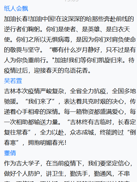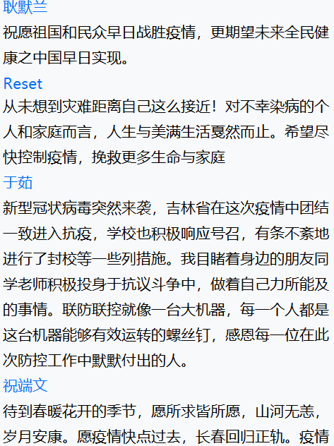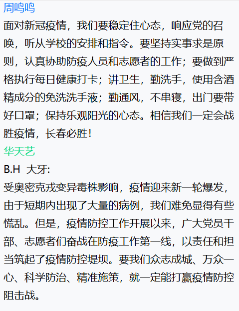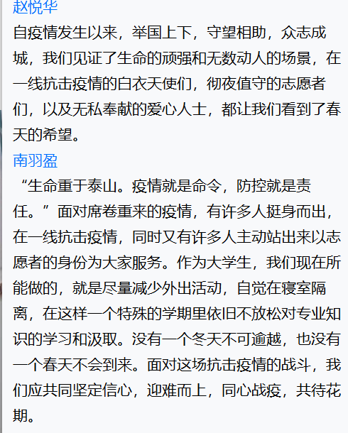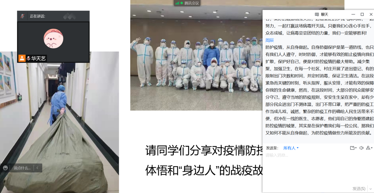 盡管本次班會在疫情中舉行,大家只能通過線上的方式交流,但是同學們仍然積極、主動參會,并且通過網絡會議表達了對一線抗疫人員的敬佩、對抗擊疫情必勝的信心,充分展現(xiàn)了青年學子的責任與擔當意識。相信只要我們攜手抗疫,同舟共濟,一定會戰(zhàn)勝疫情!