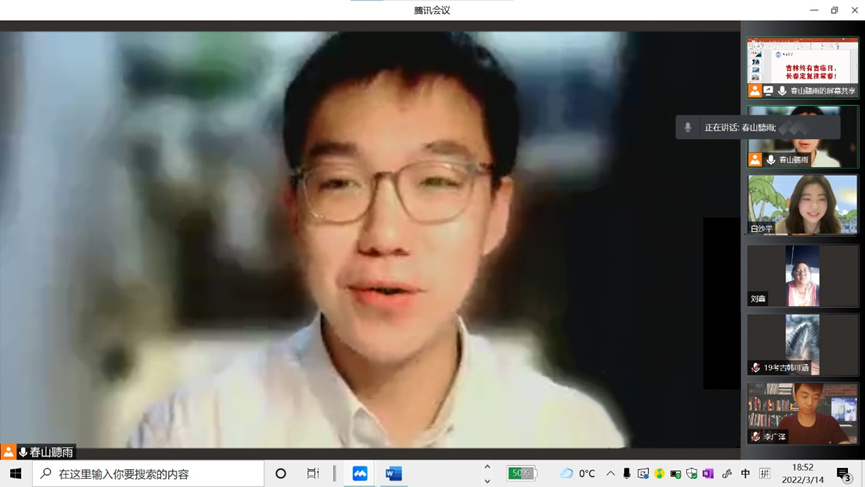????班會伊始,班主任林森老師講解了近日來吉林省與長春市的最新疫情形勢,指出當(dāng)前疫情形勢嚴(yán)峻,學(xué)校黨委、各有關(guān)部門單位迅速響應(yīng),保障同學(xué)們一日三餐準(zhǔn)時送達(dá)、全員核酸檢測扎實推進(jìn),線上教學(xué)照常開展得不易與艱辛。大家紛紛表示都感受到了來自學(xué)校的關(guān)照與溫暖。隨后,林森老師從專業(yè)課程、未來規(guī)劃到每日三餐、早晚作息等,細(xì)致了解了大家的學(xué)習(xí)生活情況;同時分享自己近來的經(jīng)歷、疏導(dǎo)同學(xué)情緒,叮囑同學(xué)們在線上教學(xué)期間,克服困難,專心致志,不讓時光虛度。