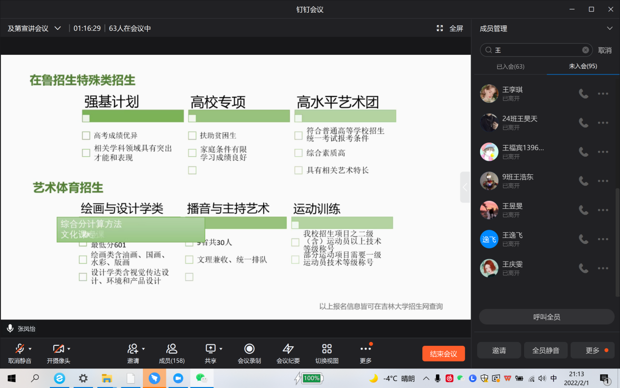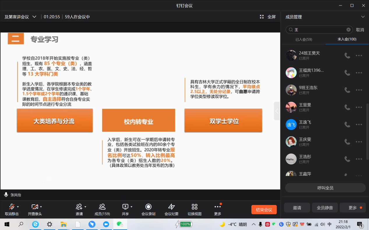 在宣講籌備工作中,張鳳怡帶領(lǐng)小組成員主動聯(lián)系高中學(xué)校老師,確定宣講的內(nèi)容和時間安排,及時擬好宣講通告,請高中老師轉(zhuǎn)發(fā)給高三學(xué)子。由于受疫情影響,張鳳怡同學(xué)和小組成員們采取線上方式進行宣講。根據(jù)統(tǒng)一發(fā)放的吉林大學(xué)的招生PPT和視頻,面向參加這次宣講活動的高三學(xué)弟學(xué)妹們宣傳吉林大學(xué)。在宣講過程中,張鳳怡同學(xué)圍繞五個方面對吉林大學(xué)進行了主題宣講:學(xué)校概況、在魯招生情況、杰出校友、學(xué)科分布、學(xué)科建設(shè)和就業(yè)前景展望。她結(jié)合自身的學(xué)習(xí)體驗,對每個方面都進行了較為詳細的介紹。為了能夠更好地讓學(xué)弟學(xué)妹們感受大學(xué)生活的美好,張鳳怡同學(xué)著重講了學(xué)校的教學(xué)資源、校園環(huán)境、便利舒適的學(xué)校生活等。另外,張鳳怡同學(xué)作為強基計劃錄取的考生,向?qū)W生和家長們講解了吉林大學(xué)的強基計劃,并積極為想要選擇吉林大學(xué)強基計劃的學(xué)弟學(xué)妹們答疑解惑。