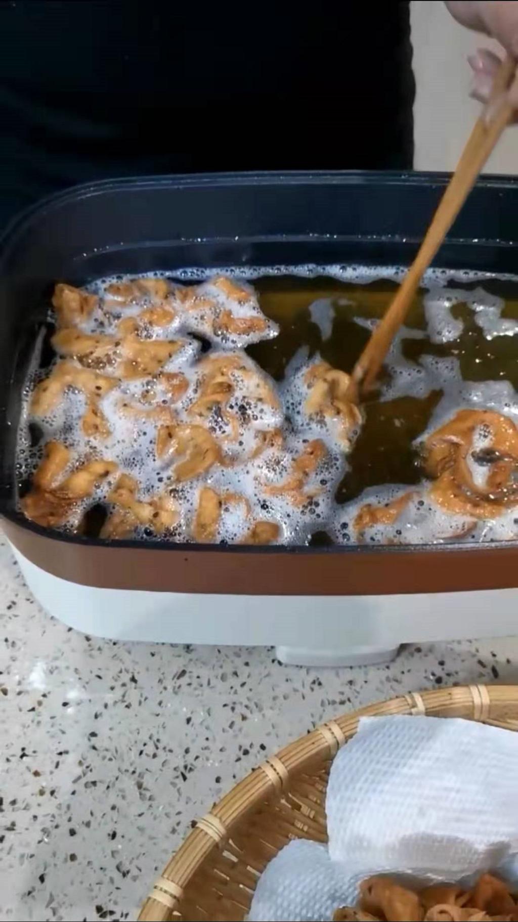 金柏宇同學(xué)則在自己親身動(dòng)手操作實(shí)踐后,向我們介紹了一份獨(dú)特的食物制作流程——炸麻葉。炸麻葉是中國北方地區(qū)傳統(tǒng)小吃,是金柏宇的家鄉(xiāng)春節(jié)習(xí)俗的一部分。炸好的麻葉因形似葉子,布滿芝麻,被稱為麻葉。制作麻葉要在盆里放入面粉、水、雞蛋、小蘇打、油、芝麻、鹽。然后和面,將面揉成光滑團(tuán)狀,蓋住盆口醒發(fā)。醒完面取出后繼續(xù)揉,壓扁搟平至薄厚均勻的圓形或矩形,這一步很關(guān)鍵,搟得越薄,炸完越脆,但過薄容易斷。用刀將面寬度均等地分為幾條,兩條相疊,縱向切成幾份,每份中間開一刀。拿起一份,將左側(cè)的面從上往下從刀縫中穿出,右側(cè)從下往上穿出,兩手輕輕一拉,放入油鍋煎至金黃,炸麻葉就大功告成,炸出來酥脆可口。