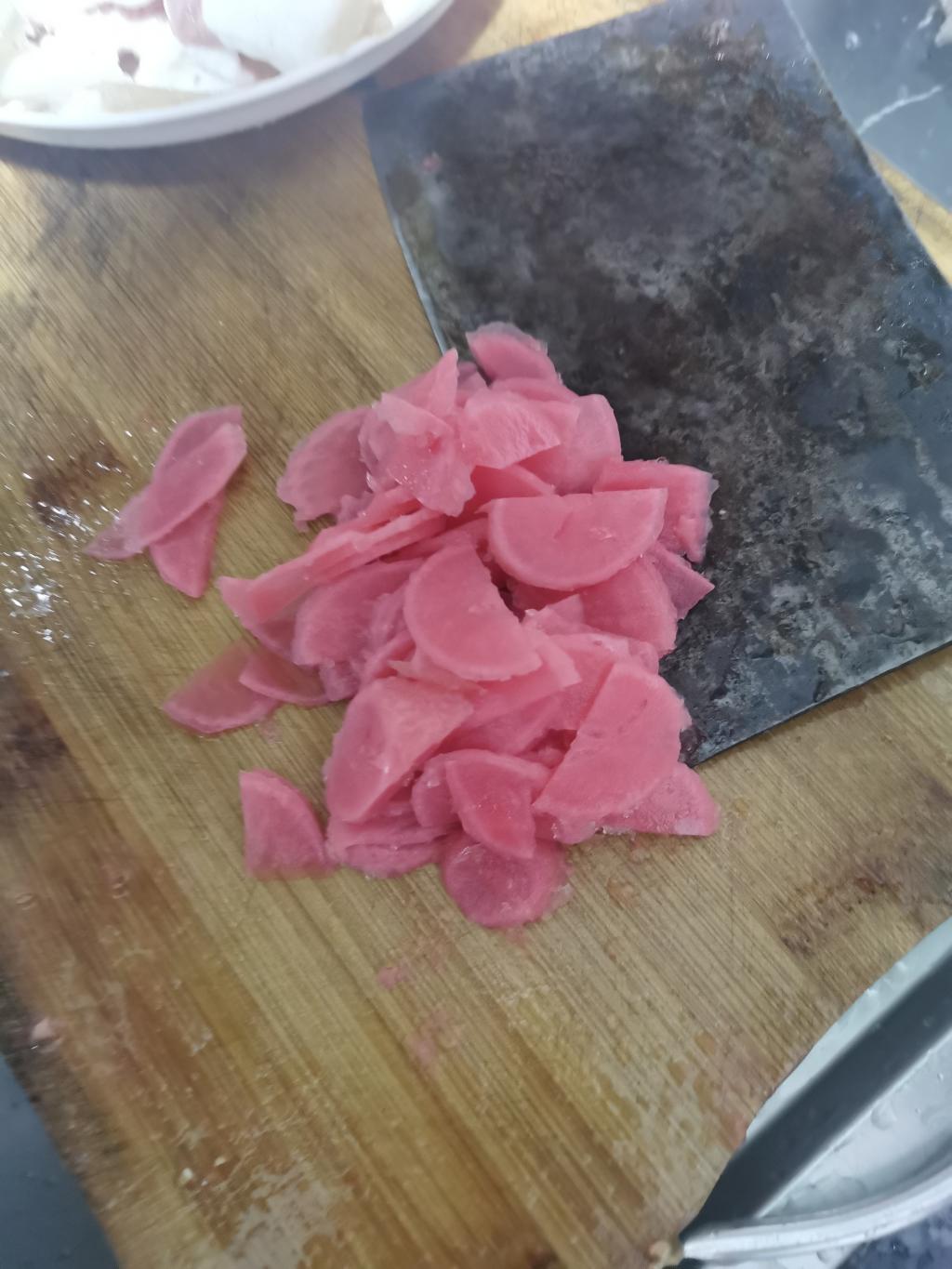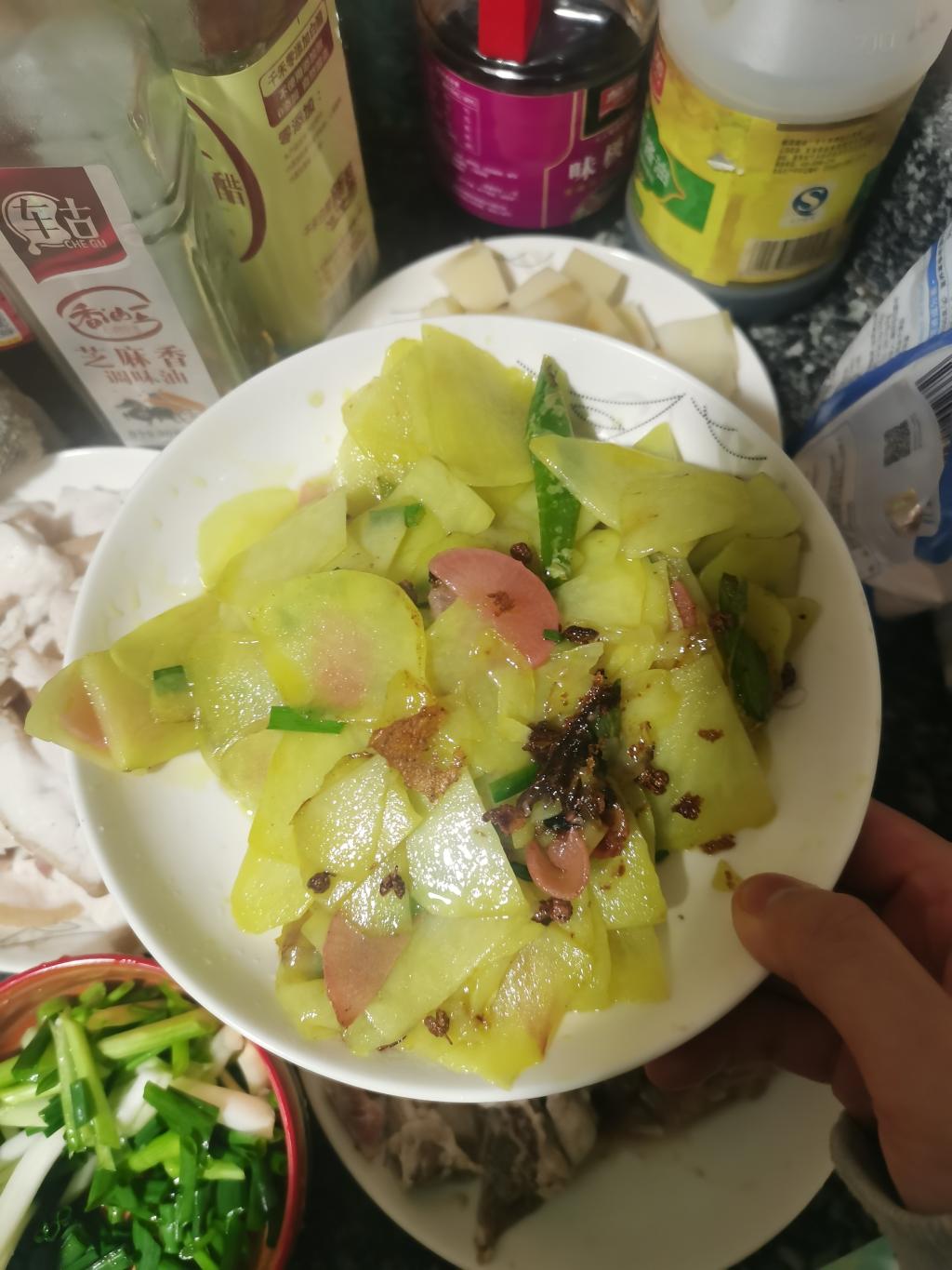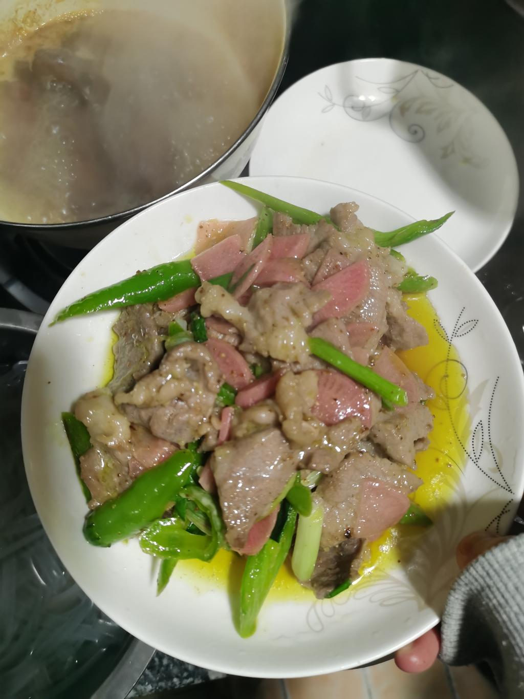 酸蘿卜炒肉——將肉、青椒、酸蘿卜切片,依次倒入于滾燙油鍋中爆炒,加入花椒、鹽、味精,翻炒待其入味后倒入盤中,撒上大蔥,制成!
