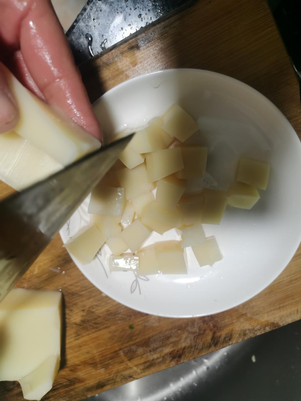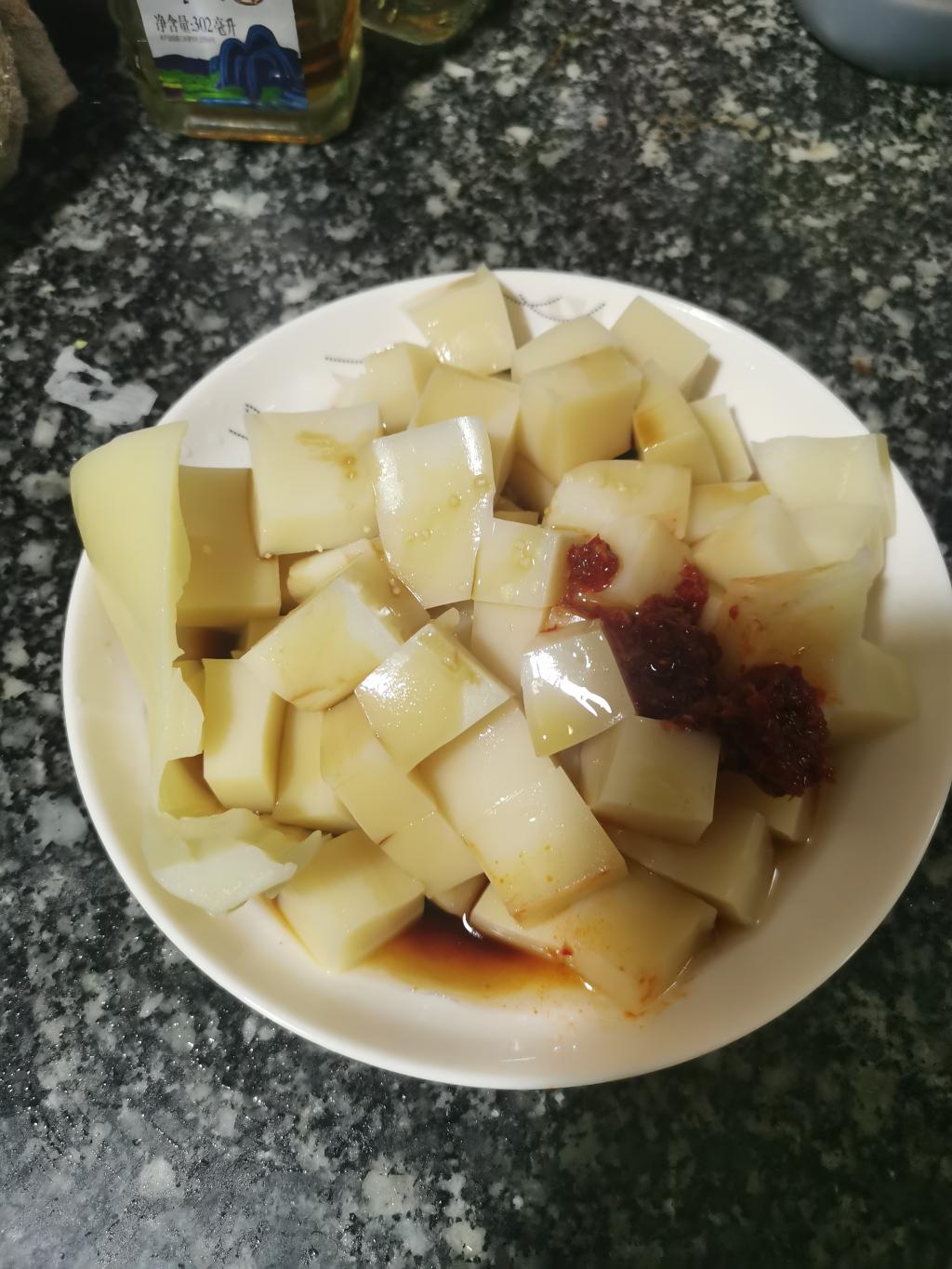 涼拌米豆腐——重慶西南地區(qū)的特色小吃。它是用米漿加堿熬制冷卻而成。王麗娜先將其切塊,倒入盤中,再加入少許味精、醬油、醋,還有特制的醬辣椒,制成!
