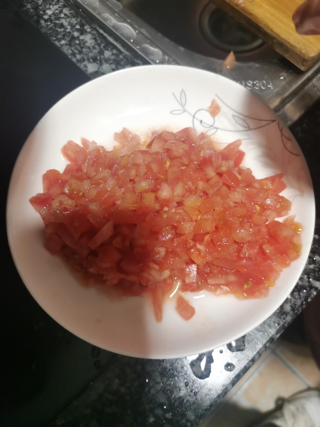 番茄炒蛋——先于番茄上切十字,于火上烤至可去皮,然后切塊;三個(gè)雞蛋倒入碗中調(diào)勻。熱鍋加入適量油,待其熱后加入番茄與蛋,不斷攪拌翻炒,加入鹽、味精,倒入盤中,制成!