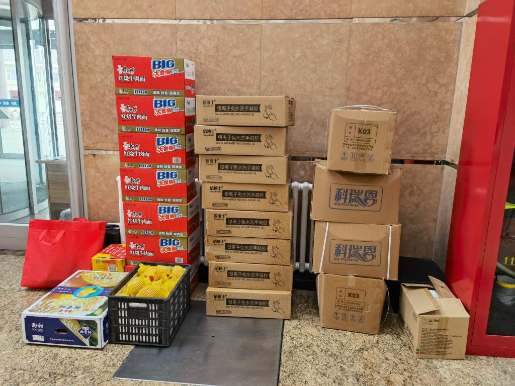 在物資發(fā)放前,各位老師分頭前往超市進(jìn)行集中采購,根據(jù)學(xué)生名額分別購買牛奶、飲用水、香腸、蘋果、桶裝泡面等食物,根據(jù)同學(xué)們的個(gè)性化需求購買濕巾、洗手液等日用品。十一時(shí)許,各位老師抵達(dá)大學(xué)城并將12個(gè)加油包整齊擺放至清潔區(qū)處,與公寓工作人員確認(rèn)學(xué)生個(gè)人信息和寢室號碼后,包裹由工作人員完成配送。當(dāng)日中午,隔離學(xué)生紛紛發(fā)來反饋,表示已及時(shí)收到加油包,并對學(xué)院的關(guān)懷表示感謝。