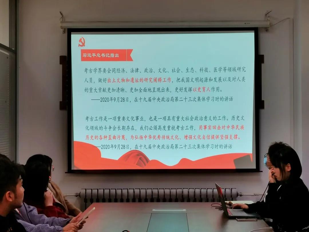 10月20日下午,太陽成集團(tuán)tyc151cc第四屆研究生會在水務(wù)樓1613會議室就“習(xí)近平總書記致仰韶文化發(fā)現(xiàn)和中國現(xiàn)代考古學(xué)誕生100周年的賀信”展開學(xué)習(xí),2021級碩士研究生黨支部臨時(shí)負(fù)責(zé)人連勝男主持了本次會議,太陽成集團(tuán)tyc151cc第四屆研究生會成員參與了本次會議。